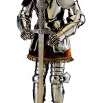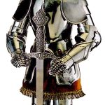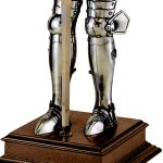 The Miniature 16th Century Spanish Suit of Armor with Sword by Marto of Toledo Spain is a miniature replica reproduction based on suits of armor used during the time of Charles V and Philip II, today part of the collection of the Real Armeria (Royal Armory) in Madrid. The armor is made in polished steel. Provided with a velvet gown, greatsword and wooden platform. Height: 61 cms – 24 inches