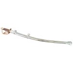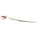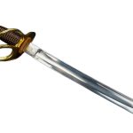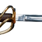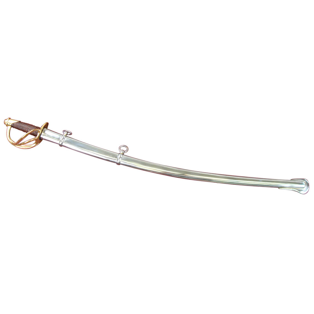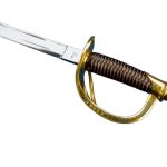 This M1840 US Heavy Cavalry Saber has an unsharpened, tempered high carbon steel blade. The blade is stamped with the recreated 1862 marking of the Ames sword manufacturing company – the foremost producer of these swords. The hilt is of brass and the grip is covered with black leather and inlaid with twisted copper wire. The scabbard is of steel with two steel hanging rings.