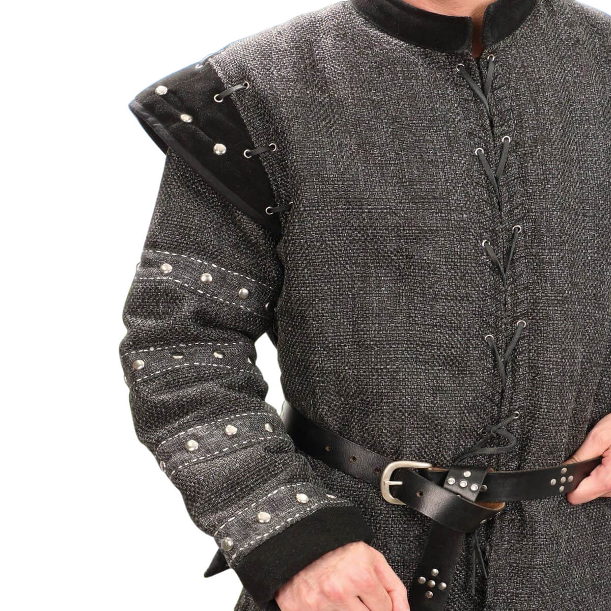 This noble two-piece poly-cotton Mordred Gambeson consists of an undershirt with padded studded sleeves and a matching sleeveless studded gambeson. Both pieces are pewter grey.