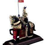 An English Knight of King Richard the Lionheart riding a horse standing on a wooden platform. The knight wears a parade suit of armor composed of a great helm with crest, a cuirass with pauldrons and bracelets and greaves on the legs. The basin and hoses are covered with red colored velvet breeches. The knight is armed with a round shield, a jousting lance with banner and a sword. The horse also is harnessed with metal parade armour enriched with relief sculpted figures and a red colored velvet caparison. Total Height: 33 cms – 13 inches