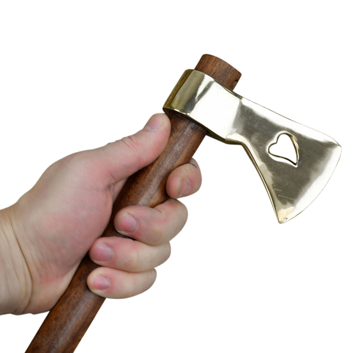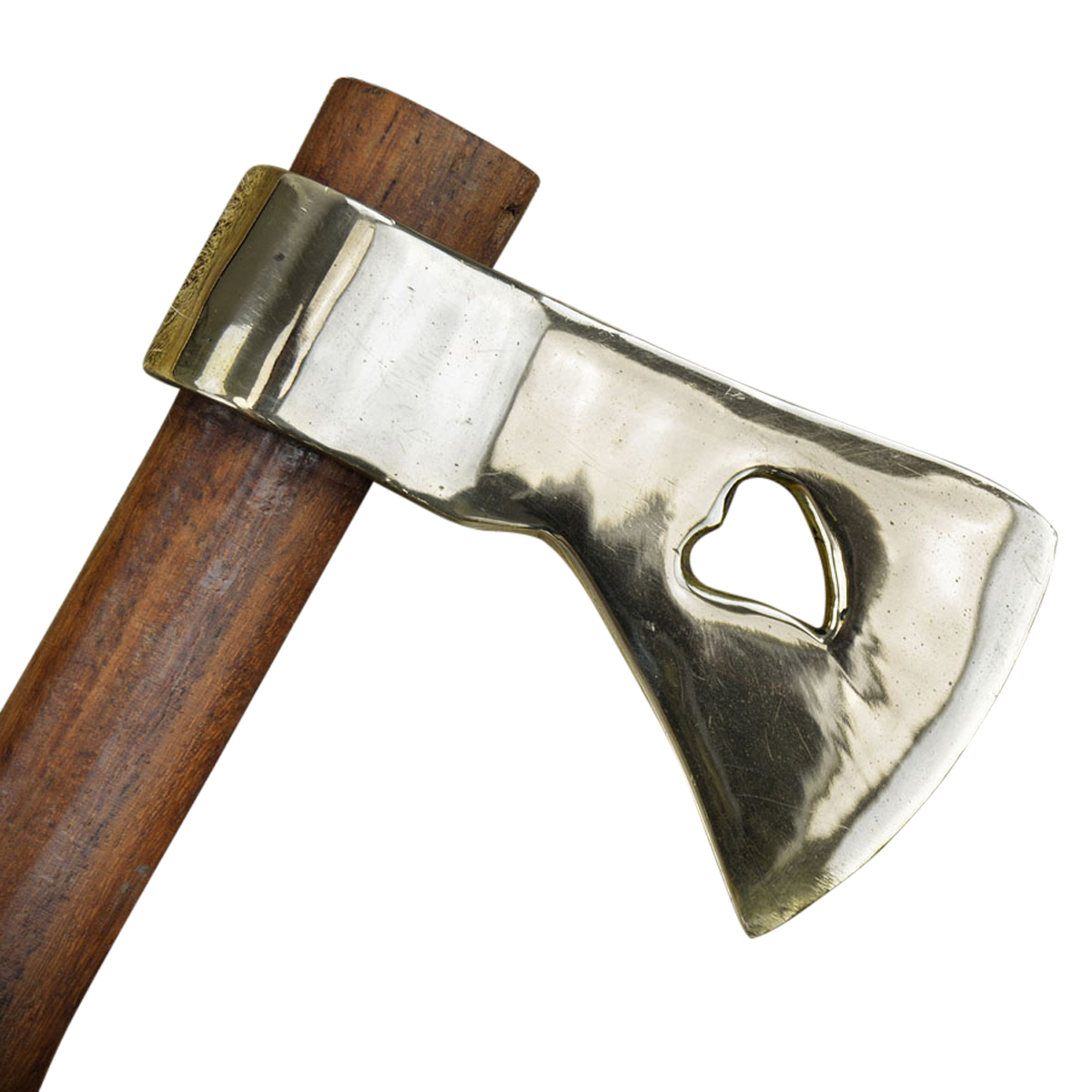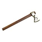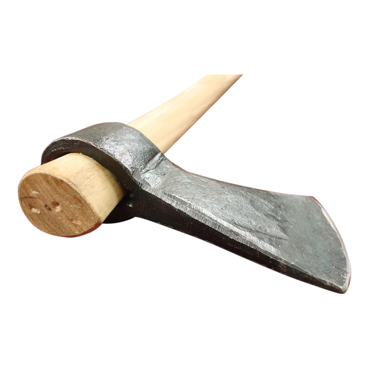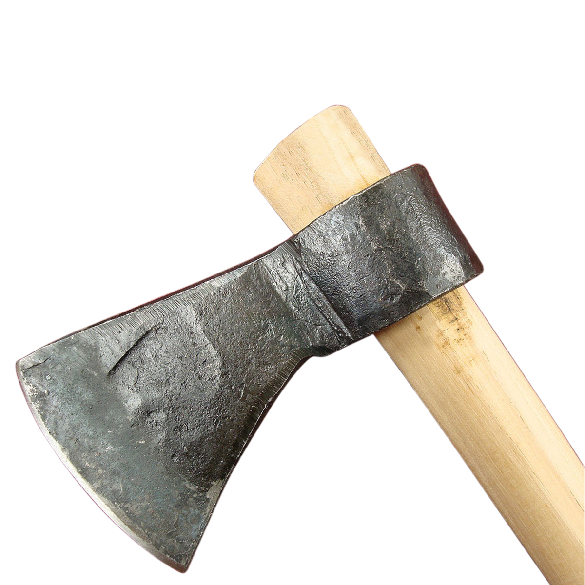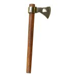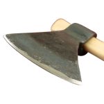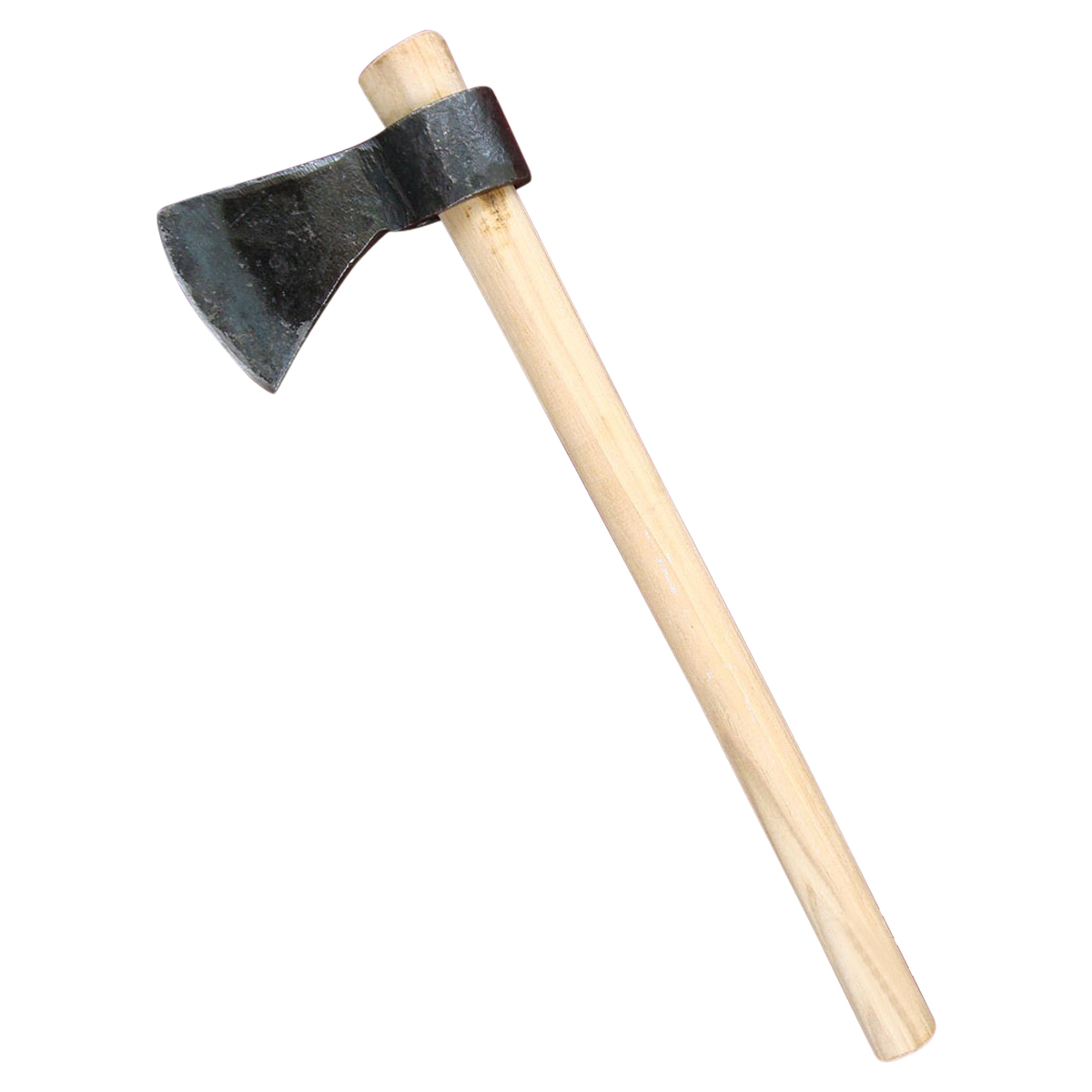 This small, unsharpened tomahawk is made from forged carbon steel and is mounted onto a wooden shaft.