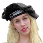 The muffin hat features an easy to use safety pin & hidden elastic band at the back covered by some metallic trim. You can machine wash and spin dry to get the dirt off. Made in the U.S.A