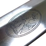 This type of saber was carried by the mounted line officers in Napoleon?s Grande Arm?e. This reproduction has an unsharpened blade of tempered high carbon steel. The blade is engraved with unit patterns and the imperial crowned eagle. The hilt is of brass and the grip is of blackened wood. The scabbard is of brass with two brass hanging rings. Crossed cannons are emblazoned onto the scabbard – a common motif of Napoleon?s officer cadre.