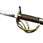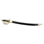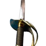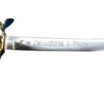 This Elite Gendarmes of the Imperial Guard Saber has a blade of high carbon steel with an etched bomb and fuse on both sides of the blade. The hilt is of brass and the grip is leather and twisted brass over wood. Replica armory and inspection markings are stamped onto the hilt.