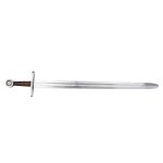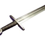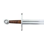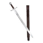 Going back to the Middle Ages comes the Norman Sword, a fine piece indeed. Available in both regular and fighting (for light combat) versions, it features a hand-forged, EN45 solid steel blade that is fullered, along with a single tang, and accompanied by a leather scabbard. Based on historically accurate design, this is a worthy choice for reenactments, costumes, and collections. This is our fighting version of this sword and as such contruction allows for metal to metal contact training.