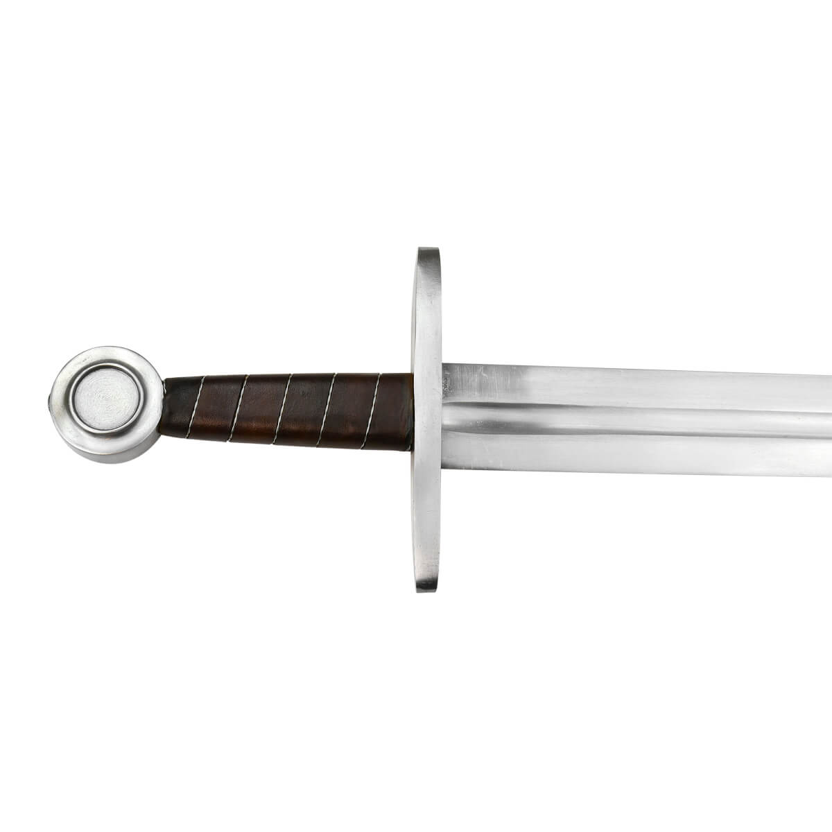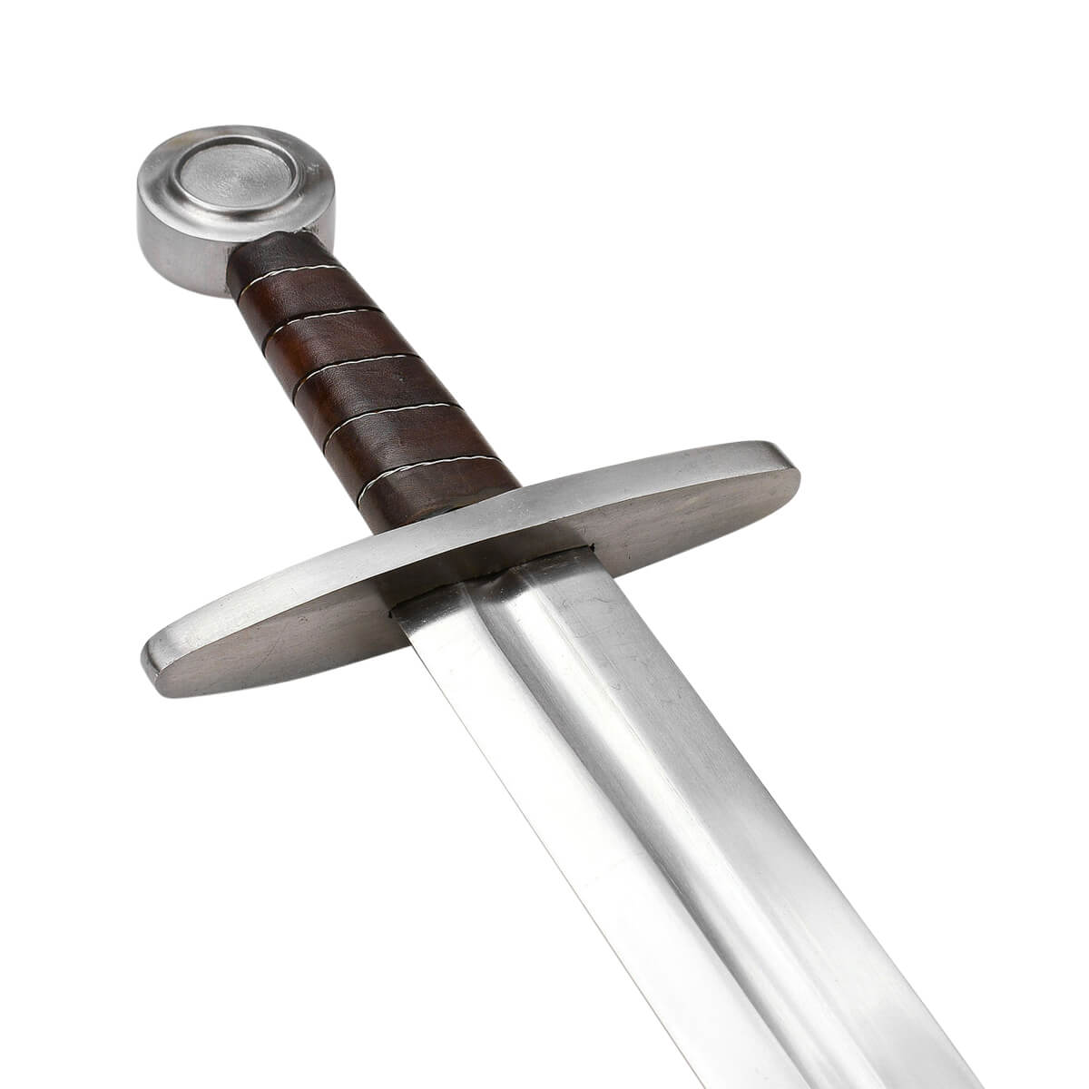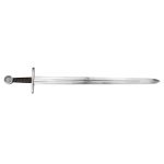 Going back to the Middle Ages comes the Norman Sword, a fine piece indeed. Available in both regular and fighting (for light combat) versions, it features a hand-forged, EN45 solid steel blade that is fullered, along with a single tang, and accompanied by a leather scabbard. Based on historically accurate design, this is a worthy choice for reenactments, costumes, and collections. This is our “regular” version of the sword and is not recommended for full on metal to metal contact combat training. Please see our “fighting” version for combat use.