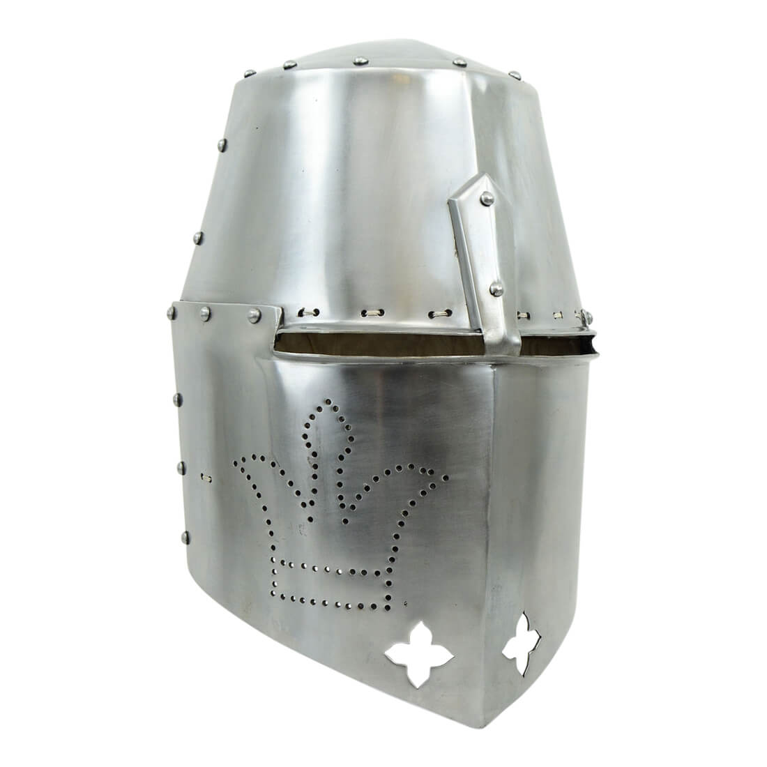 The Over Bearer Great Helmet made by Deepeeka is an accurate replica ornate based off historical research and authentic in its design. The great helm or heaume, also called pot helm, bucket helm and barrel helm, of the High Middle Ages arose in the late twelfth century in the context of the crusades and remained in use until the fourteenth century. They were used by knights and heavy infantry in most European armies between about 1220 to 1540 AD, however they were used widely throughout Christian armies in the Third Crusade (1189?1192). This Great Helm is stoutly constructed from riveted plates of 14 gauge steel. The blackened interior is well padded with shock absorbing foam overlaid in cotton.