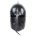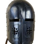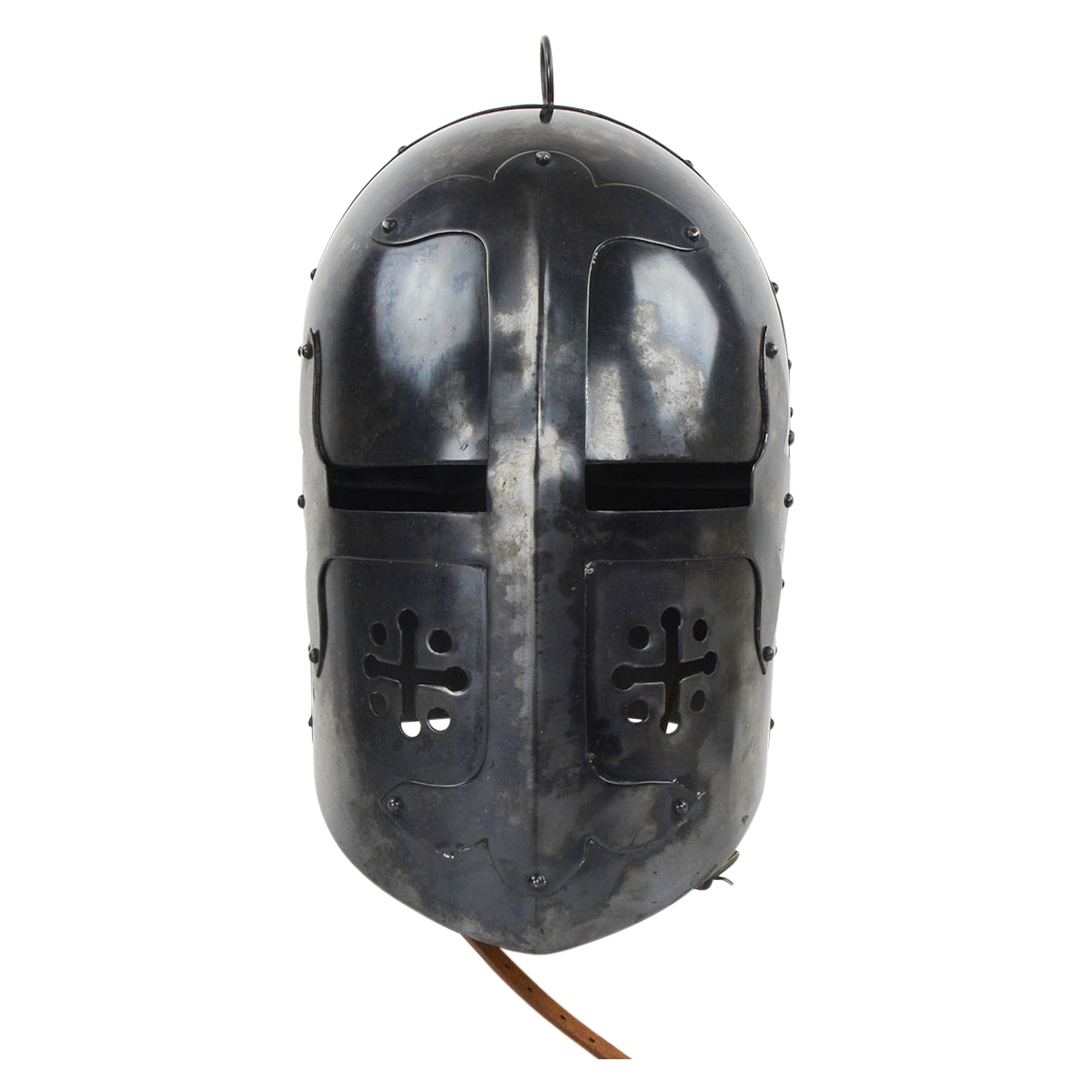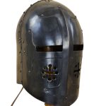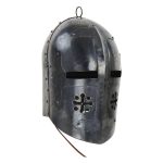 Emerging in the mid 12th century and carrying through the 13th century, the Great Helm was a piece of superior protection. Often worn over a smaller helmet, the Great Helm offered great reinforcement against weapon penetration. These helmets were common in the Crusades among knights and European armies and are somethimes referred to as “Crusader Helmets”. Made by Deepeeka, the Over wearer Great Helm accurately replicates those seen in old illustrations and monuments. Crafted of heavy duty 16 gauge steel, this helmet is sure to stand out and illuminate power. The helmet interior has a leather suspension liner which can be adjusted and it also has a chin strap of thick leather with an adjusting antiqued brass buckle.