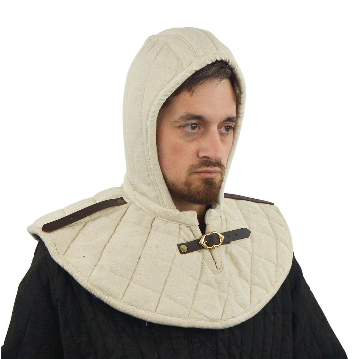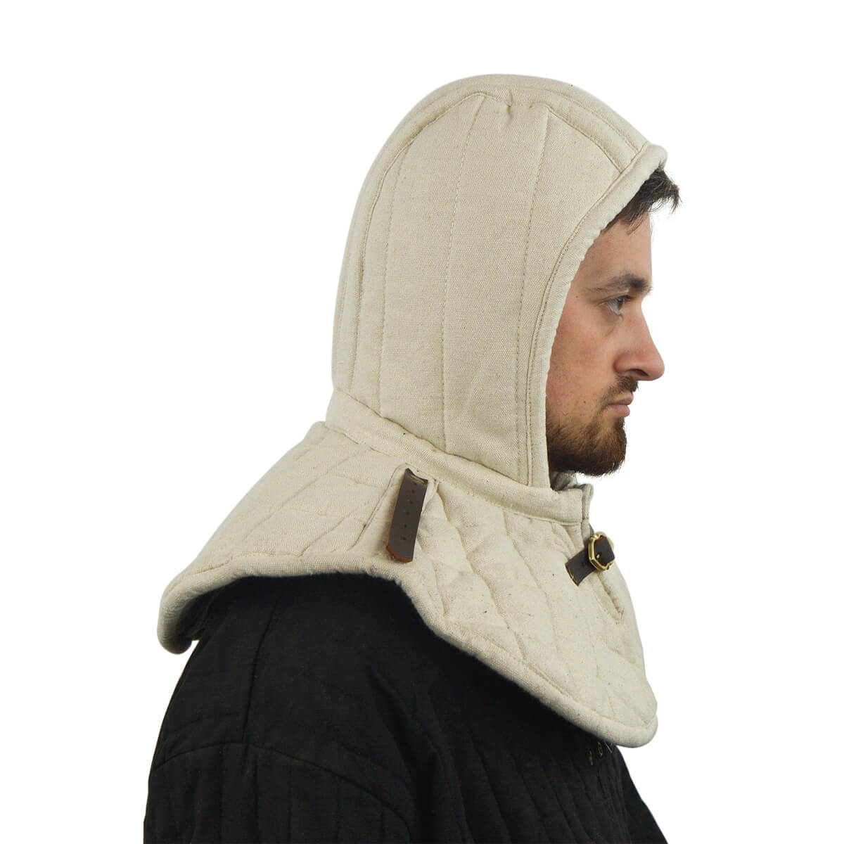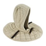 This arming hood is made from durable cotton and padded with wool on the inside. A brass buckle and leather strap on the front can be used to secure it closed. Two additional leather straps are riveted onto the hood and these can be used to buckle pauldrons and other armor into position.