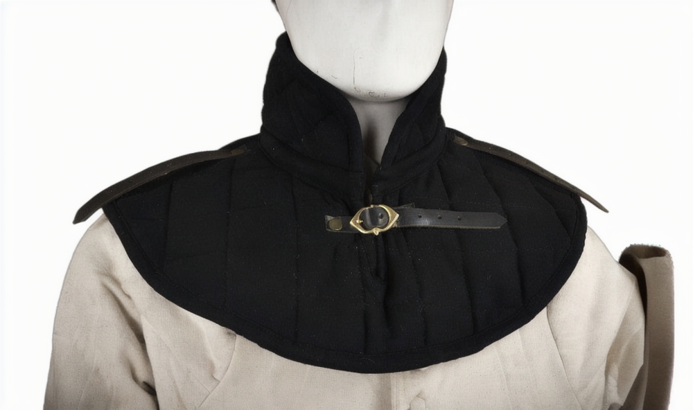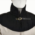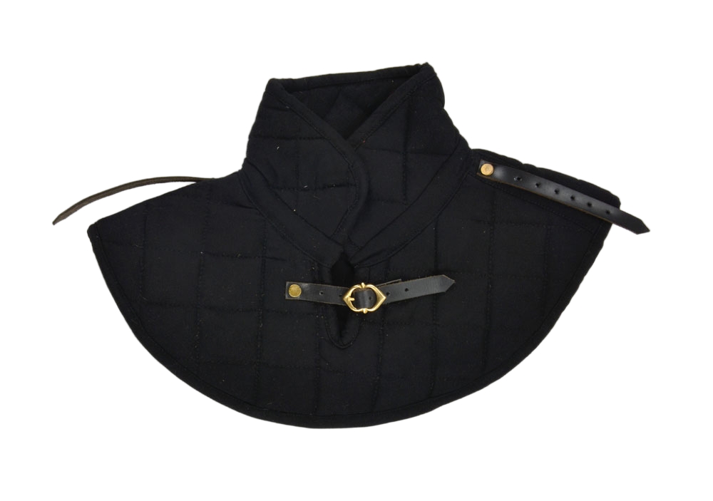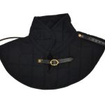 This Padded Gambeson Collar is constructed from robust quilted cotton. It is padded with wool felt – an organic material that will breathe better than poly-fill. A brass buckle and strap adjust it to fit. Two additional leather straps on the shoulder allow armored pauldrons to be fitted onto the collar. One size fits most.