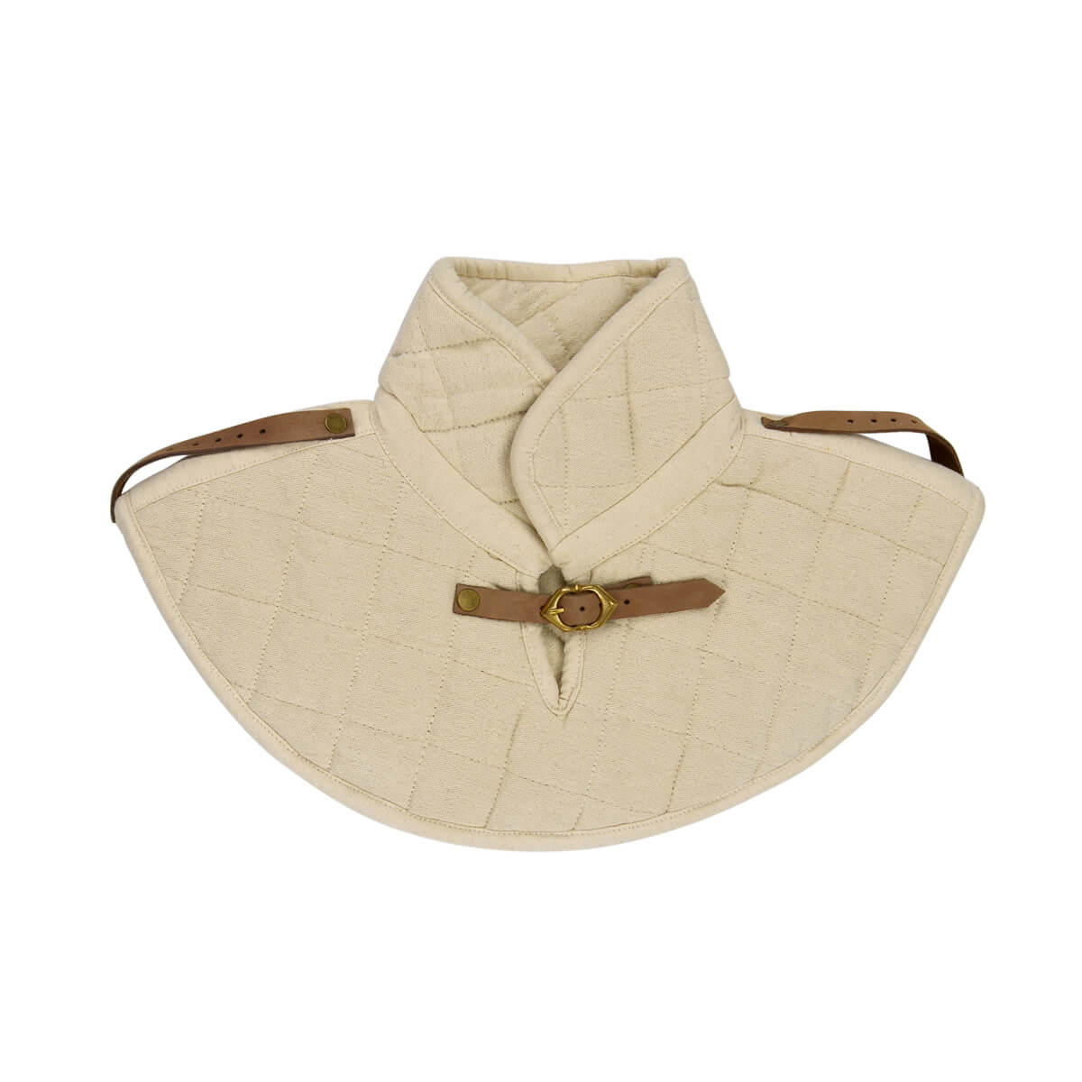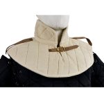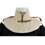 This Padded Gambeson Collar is constructed from robust quilted cotton. It is padded with wool felt – an organic material that will breathe better than poly-fill. A brass buckle and strap adjust it to fit. Two additional leather straps on the shoulder allow armored pauldrons to be fitted onto the collar. One size fits most.