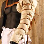 This padded Gladiator Arm Guard is crafted from durable canvas cloth which is padded and filled on the inside. It is attached to the torso with a dual-buckle harness of leather with antiqued brass buckles. The arm guard is then tightened to fit around the arm with a set of leather lacings.