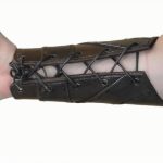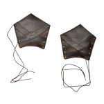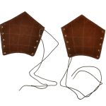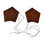 These leather bracers are constructed from high quality leather and feature an outer shell of thick vegetable tanned leather and an inside lining of soft suede leather with padded material in between for comfort and impact cushioning. The greaves are constructed with tight and sturdy stitching and they are fastened to the leg with its included leather laces which are laced through eyelets of antiqued brass. They are highly adjustable to size.Torso armor and greaves which match these bracers are also available separately.