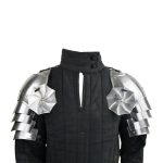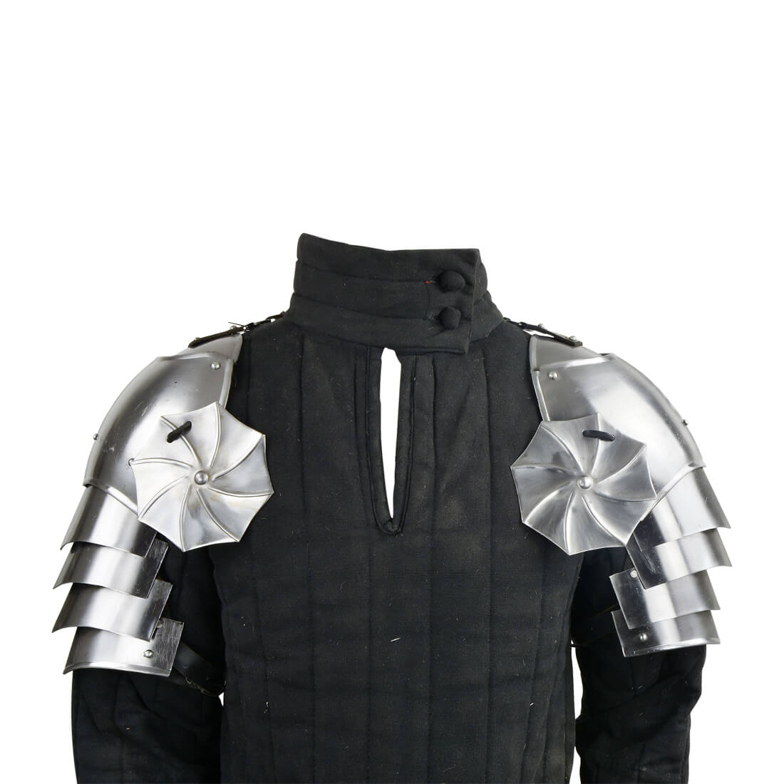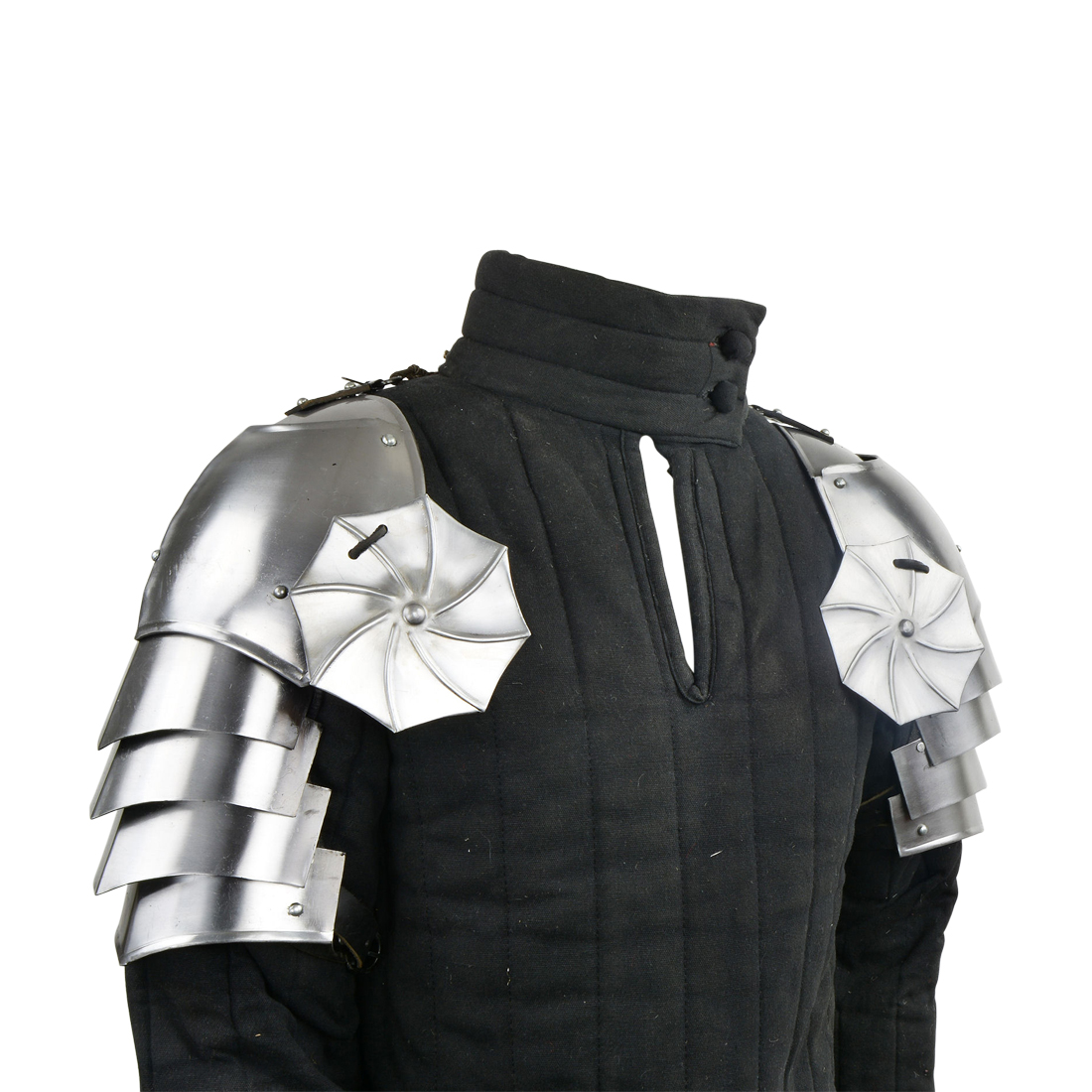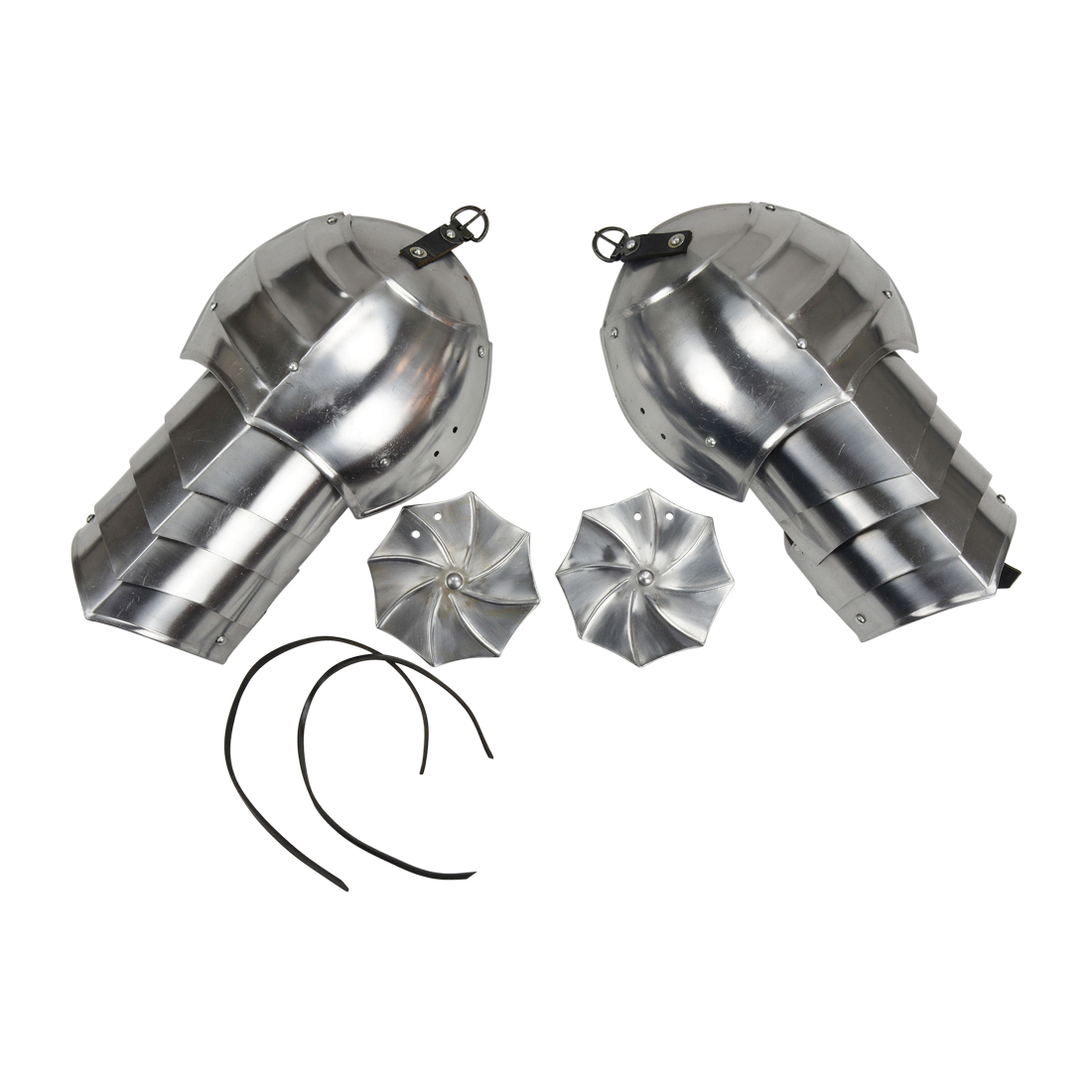 This pair of pauldrons are constructed from 16 gauge steel and come with a set of rondel discs which are tied directly into the armor with leather cords (included). The armor is articulated with internal, riveted leather banding. A buckle at its top allows it to be buckled onto a gorget or cuirass with a leather strap intended for hanging a pauldron. The bottom strap fits the armor to the upper arm.