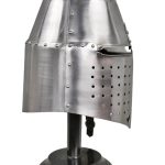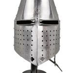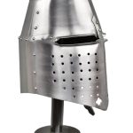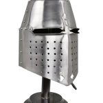 This 14th Century Great Helm is based on the helm of Sir Richard Pembridge, an English knight who served King Edward III during the Hundred Years War. The helmet is a great example of the type of Great Helm worn by knights and professional men-at-arms at battles such as Crecy (1346) and Poitiers (1356). These domed-top Great Helms were a notable improvement over flat-topped helms by better deflecting and redirecting the force of a downward blow. The raised ridged at the eye slits give them greater durability to prevent easy deformation and the large quatrefoil cut-outs serve as an anchor point for a chain-toggle that would have been connected to the breastplate. This chain connection allowed for knight the remove the helmet and free his hands for other weapons or his mount’s reins as needed without fearing for the loss of his helmet. (No chain toggle is included).