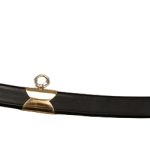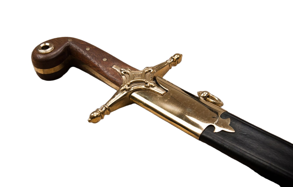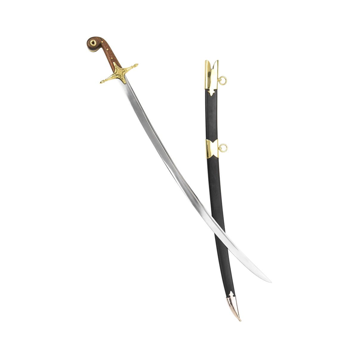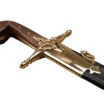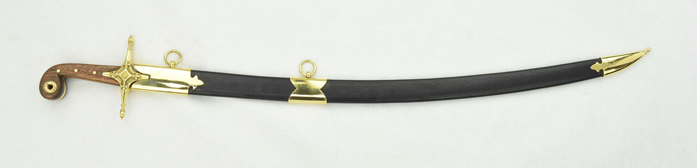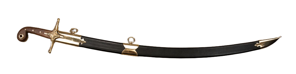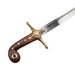 This swift-striking Persian Shamshir has a tempered blade forged from high carbon steel; the guard is brass and the polished wood grip is embellished with brass fittings. The two wooden halves of the grip are durably riveted to the the stout and thick blade tang. Included with the sword is a scabbard of thick black leather with brass accents and brass hanging rings.