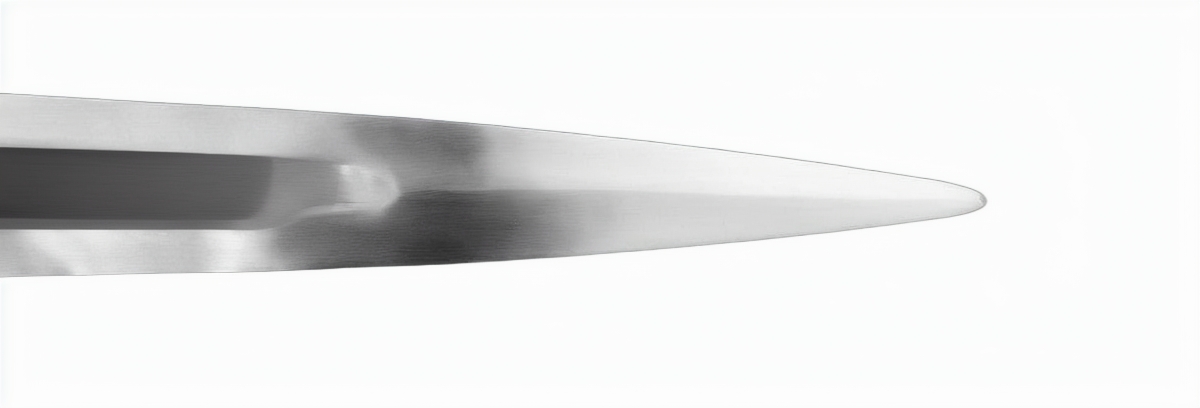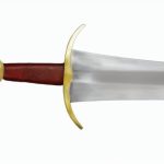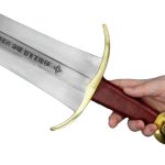 The kingly Philippe IV sword from Deepeeka has a tempered blade of high carbon steel which is sturdily mounted into the hilt with a peen over the pommel. The guard and pommel are brass and the grip is wood with bold red leather.