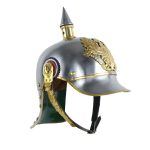 The Pickelhaube 1889 PreuBen Kurassier Army Helmet made by Deepeeka is an accurate replica ornate based off historical research and authentic in its design. This helmet was developed in the 19th century by King Frederick William IV of Prussia. It was typically used by German military as well as firefighters and police. Our model is made of 18 gauge steel and comes with two round colored cockades (left is black & white and right is red, black & white). It also features a winged eagle that was used as a symbol for Prussia. The iconic spike is made of brass and steel and contains a brass chinstrap with buckle. This helmet will be a great addition to your your collection, a companion to your high-end costume or simply for impressing friends and family!