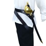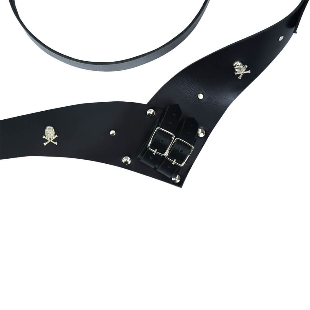 When sailing the high seas and pillaging land for treasure, you never know when danger may arise. Thus the Pirate Sword Belt and Frog is bound to come in handy to ensure your sword is always by your side and ready for action. Stylishly crafted from top quality leather with steel rivets, this accessory is highlighted by skull and crossbone conchos. A perfect fit for the sword scabbard is enabled by a pair of adjustable steel buckles while an additional steel buckle fits around the waist. This is a belt any pirate lover will want to own and it is great for costumes and re-enactments.