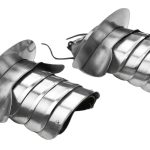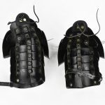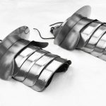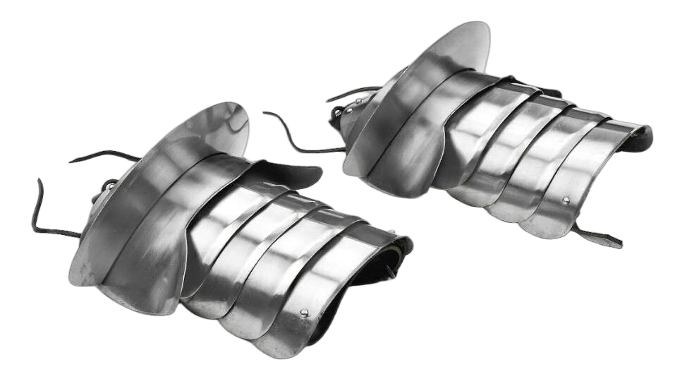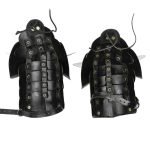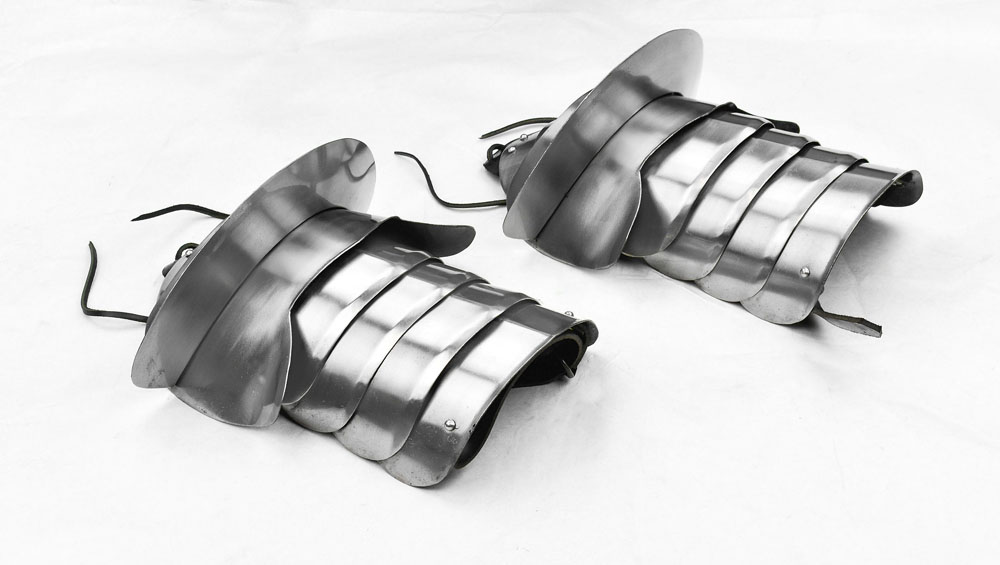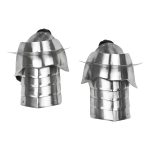 This set of plate pauldrons with vertical blade breakers to protect the neck and collar are crafted from 18 gauge steel; internal riveted leather banding provides the needed articulation of the plates and a perforated leather tab allows for them to be secured and tied onto a gorget or breastplate (leather cords are included additional armor is not included). A leather strap with a steel buckle at the bottom secures the armor to the upper arm.