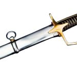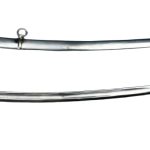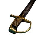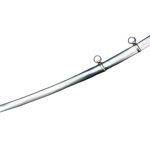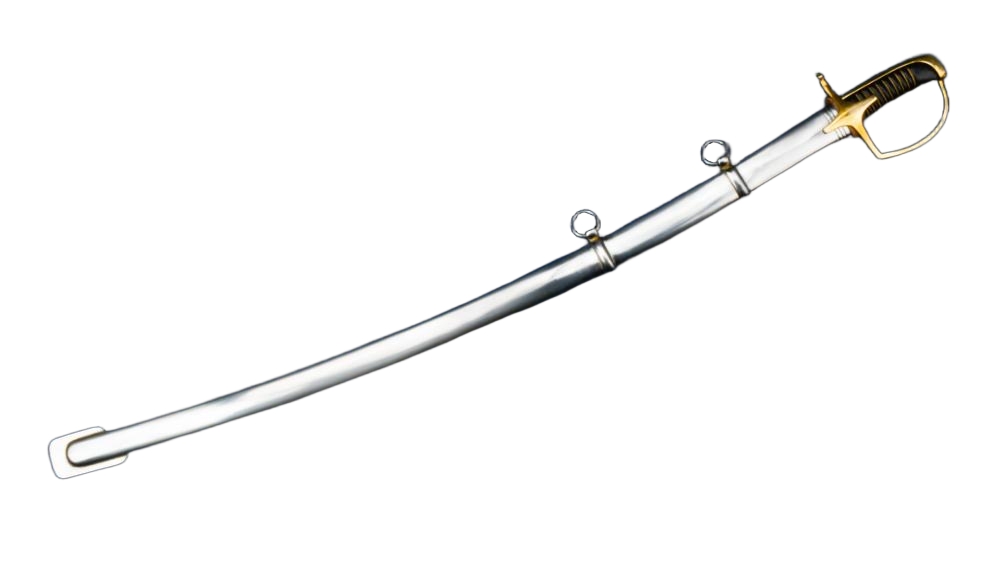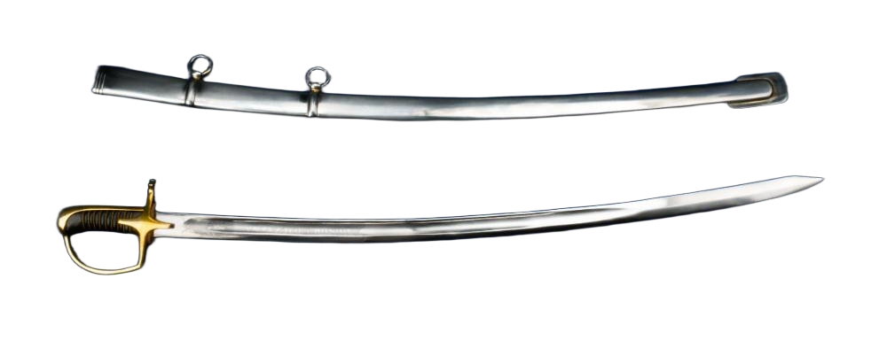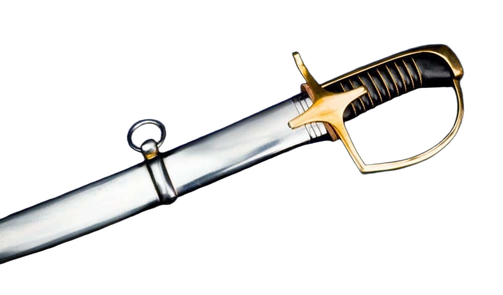 The hilt is cast from polished brass, just like the originals, lending both durability and a warm patina over time. The grip is crafted from wood, wrapped in black leather for a secure hold, and accented with hand-inlaid braided brass wire, a detail that not only reinforces the grip but also reflects the care given to these weapons. The blade is firmly seated into the hilt, ensuring it withstands the rigors of use. Accompanying the saber is a steel scabbard equipped with two steel hanging rings for easy carry and attachment to a uniform belt.