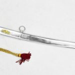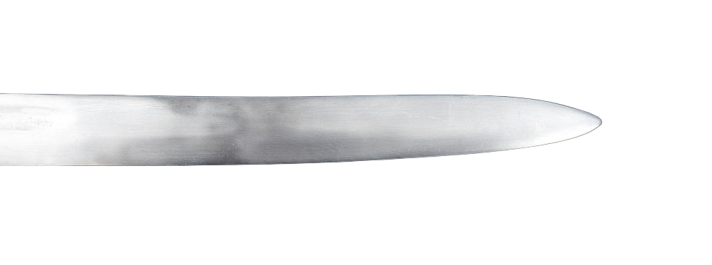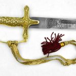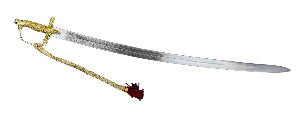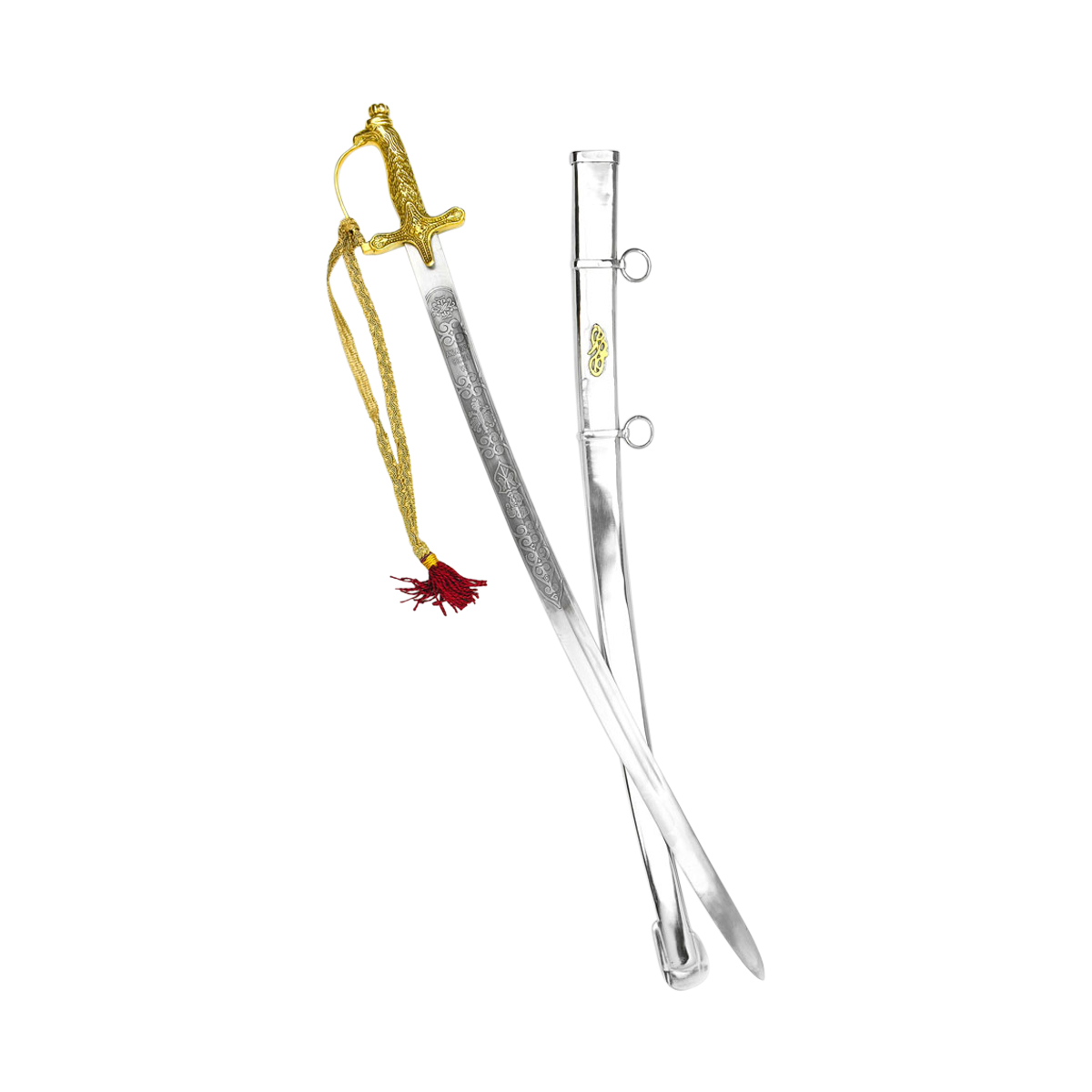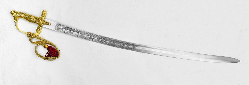This reproduction of a sword once owned by General Wladyslaw Sikorski has a blade of high carbon steel which is etched on a single side with scrollwork filigree and the words Honor Ojczyzny (Honor and Fatherland). The blade is strongly mounted into a hilt of fine cast brass and is finished with a braided sword knot. The scabbard is crafted from steel and is completed with a pair of steel hanging rings.