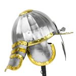 This Polish Winged Hussar helmet has the stylings and ornamentation typical to these fantastically famous cavalrymen. It is crafted from 16 gauge steel and embellished with riveted brass trim and accents. The neck and cheek plates are all hinged and articulated and the face guard plate is secured with a key and screw on the brim; it can be removed entirely if desired.