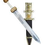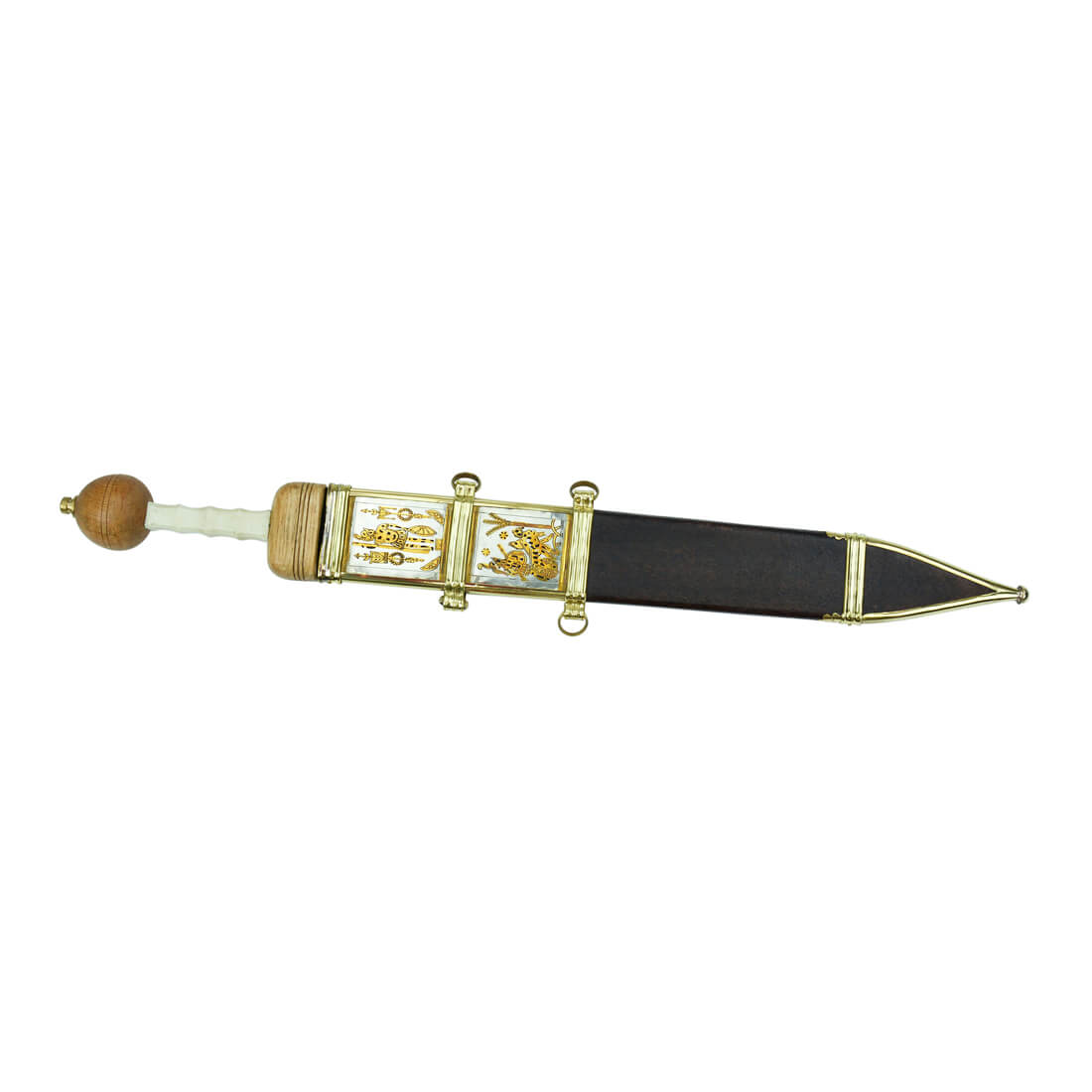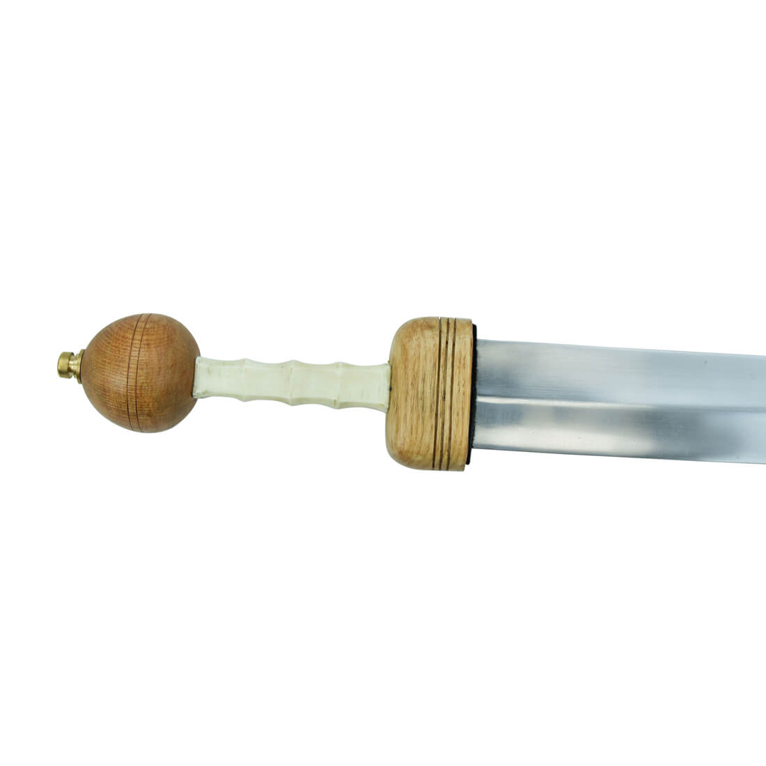 This Roman Pompeii style Gladius has a blade crafted of high carbon steel; the hilt has a grip of carved bone and its pommel and guard are of wood. The inset guard plate is brass, as is the pommel nut. A felt tab cushions the guard against the scabbard – it can be easily removed if desired.