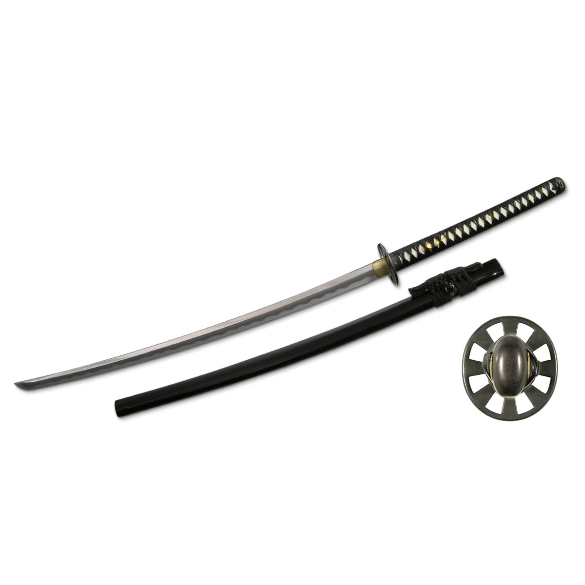 The Practical Pro Katana from Hanwei is built as an economical cutting sword for heavy targets, with an extended tsuka and a thicker and longer blade. The blades of the katana are constructed from hand-forged, high-carbon steel and are differentially hardened using a traditional claying method. The Practical Pro Katana has a finer polish than others in the series. The tsuka is wrapped with synthetic black leather for its gripping characteristics and is double-pegged for safety. The saya is finished in a deep black lacquer with a black cotton sageo. The katana is stylized with a round Kuruma tsuba, which represents the Wheel of Dharma, symbolizing the Buddhist concept of the Noble Eightfold Path.