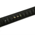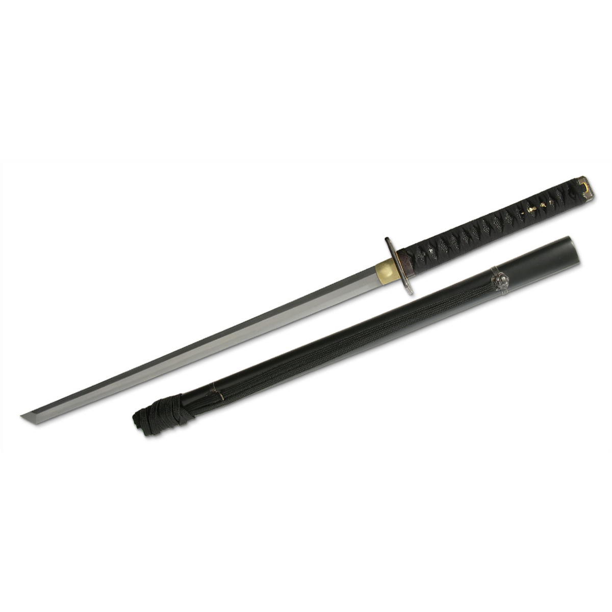 The Practical Shinobi Ninja-tofrom Hanwei, whose construction patterns closely that of the Practical Katana, is a useful piece for those studying the Way of the Ninja. The blade is hand-forged in high-carbon steel and is differentially hardened using the traditional claying method. All of the fittings are finished in antiqued black iron. The ornate tsuba displays the kuji-kiri (energy-channeling hand positions) employed by the mystical ninja. The tsuka is wrapped in a synthetic black ray skin (same) and the tsuka-ito is in durable synthetic black leather. The saya has flat black finish with demon-head bindings for the black Japanese cotton sageo and an intricate kojiri. A sword no practitioner of Ninjutsu should be without.