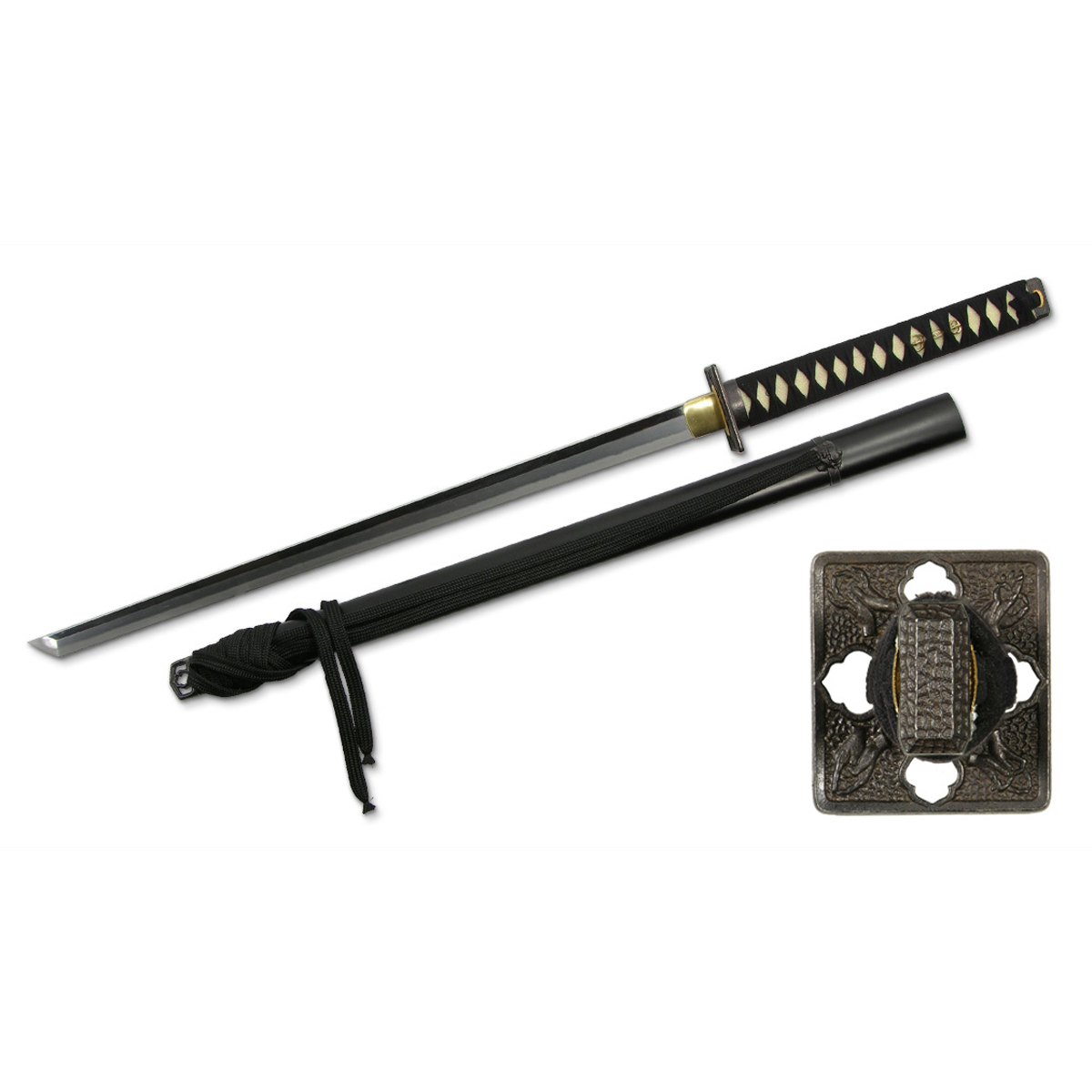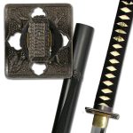 The Practical Shinobi Ninja-to from Hanwei , whose construction patterns closely that of the Practical Katana, is a useful piece for those studying the Way of the Ninja. The blade is hand-forged in high-carbon steel and is differentially hardened using the traditional claying method. All of the fittings are finished in antiqued black iron. The ornate tsuba displays the kuji-kiri (energy-channeling hand positions) employed by the mystical ninja. The tsuka is wrapped in a synthetic white ray skin (same) and the tsuka-ito is in durable synthetic black leather. The saya has flat black finish with demon-head bindings for the black Japanese cotton sageo and an intricate kojiri. A sword no practitioner of Ninjutsu should be without.