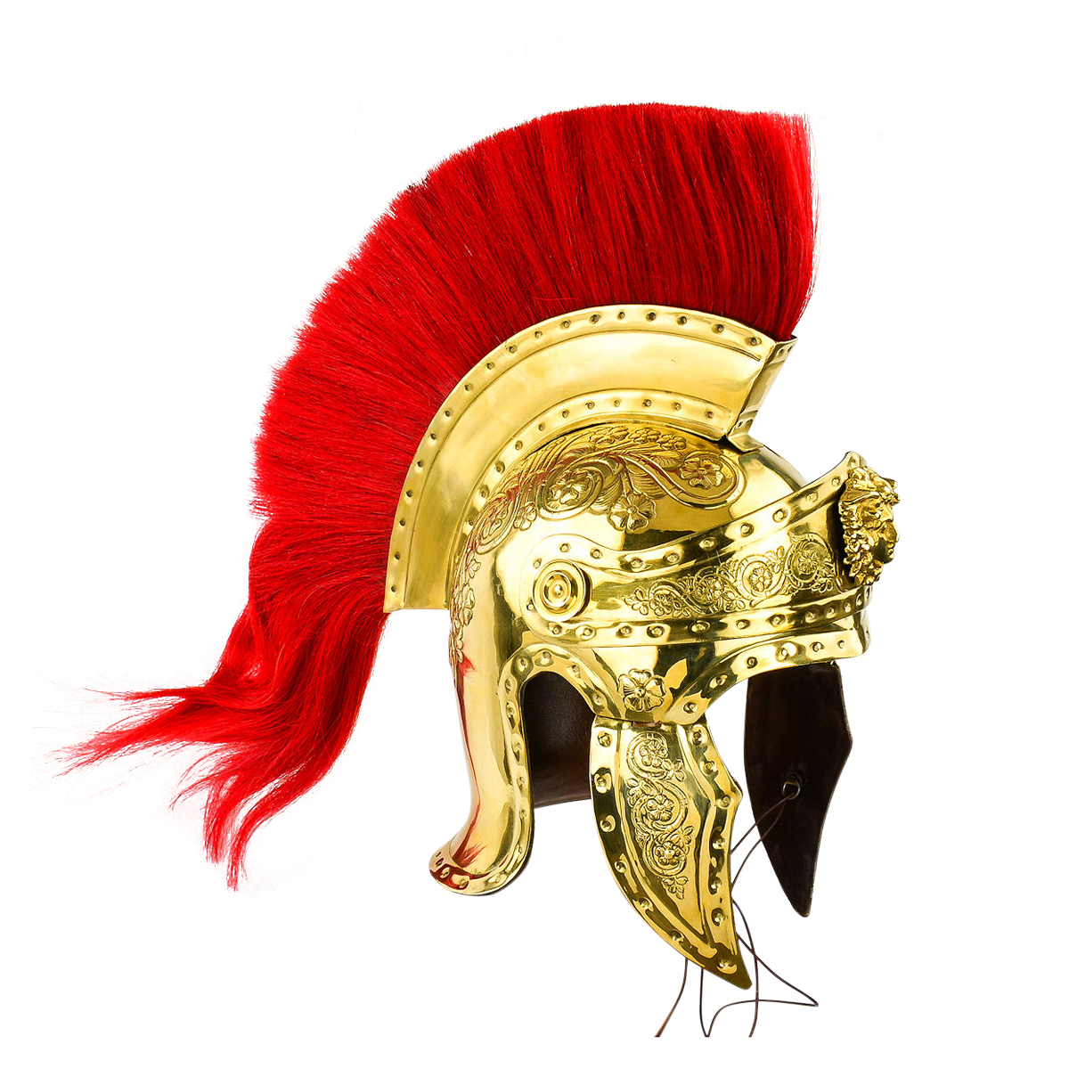 Our helmet is an impressive, historical accurate replica of the helmet worn by the Praetorian Guard. This Roman Praetorian Helmet is fittingly well-embellished in brass detailing and a plume of red-dyed horsehair. Constructed from brass, the cheekplates are hinged and the interior is entirely lined in tightly fitted leather and fitted with an integrated internal suspension liner that can be adjusted to modify and fine-tune the fit of the helmet to the head. Rings on the interior of the cheekplates allow for a chinstrap to be tied into place to secure the helmet and the placement of the cheekplates.