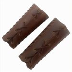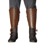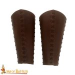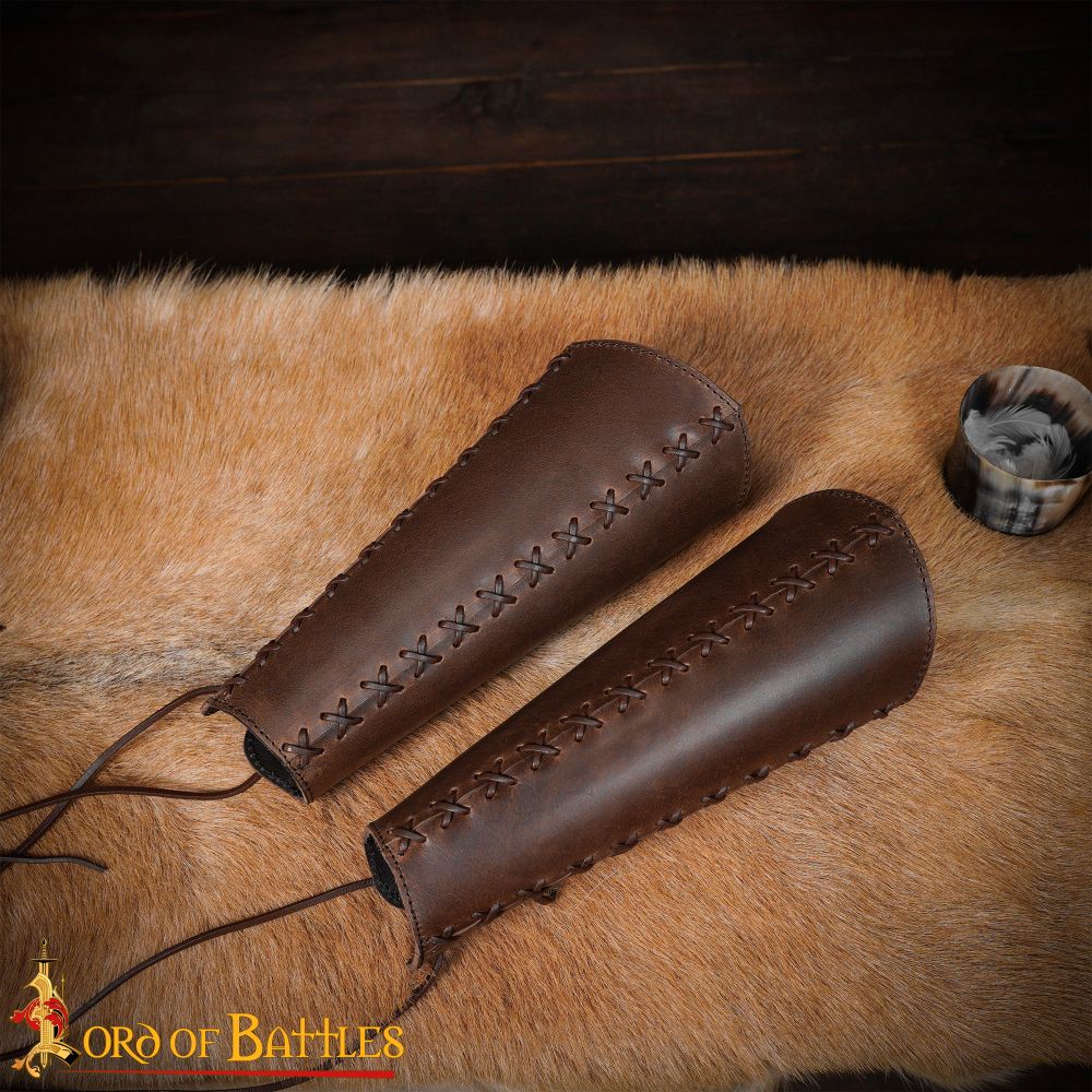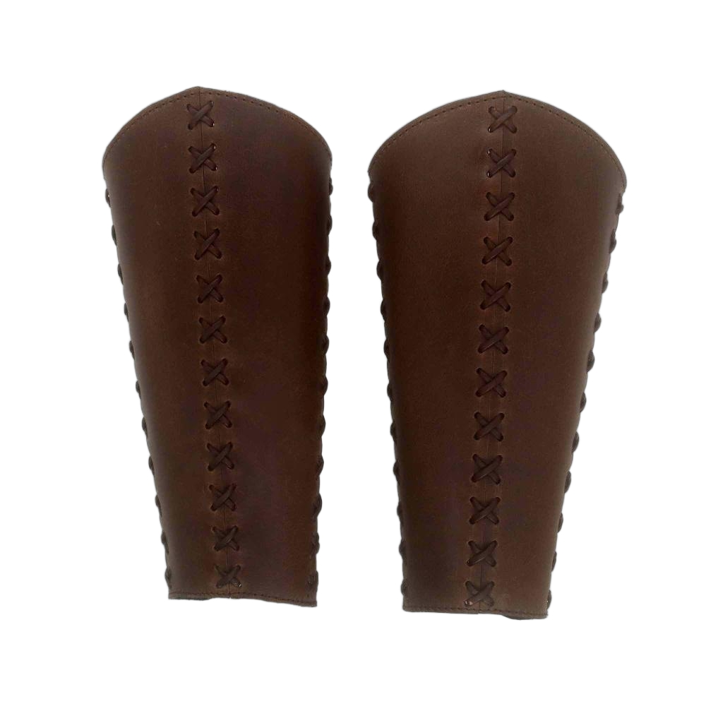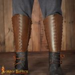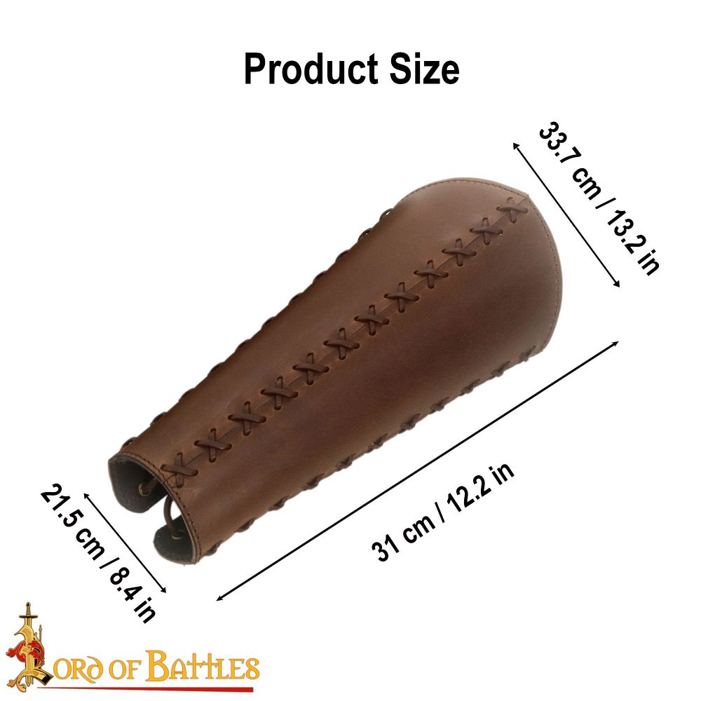 These greaves are handcerafted by our skilled craftsmen from genuine buff leather. For an adjustable fit, a set of genuine leather strings is attached. Each greave has a length of approx. 31 cm, upper width of approx. 33.7 cm, and lower width of approx. 21.5 cm.
