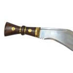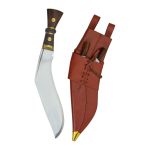 The Regimental Khukuri has an unsharpened blade of high carbon steel and a composite grip of polished wood and brass over the thick full tang. The wooden scabbard is bound in leather and fitted with a brass tip chape and a removable leather frog with integrated belt loops.
