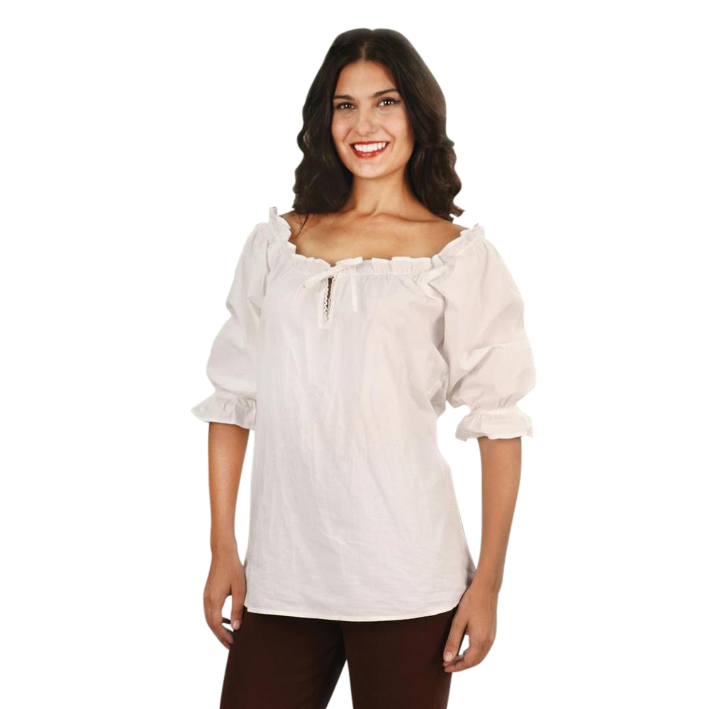 Our Faire Blouse is a versatile top which can be worn on or off the shoulders, depending on your flirtatious mood. It features an adjustable string tie neck which includes hidden elastic to allow for a great fit for a variety of body styles. It is handmade in soft white cotton with elastic at the cuffs.