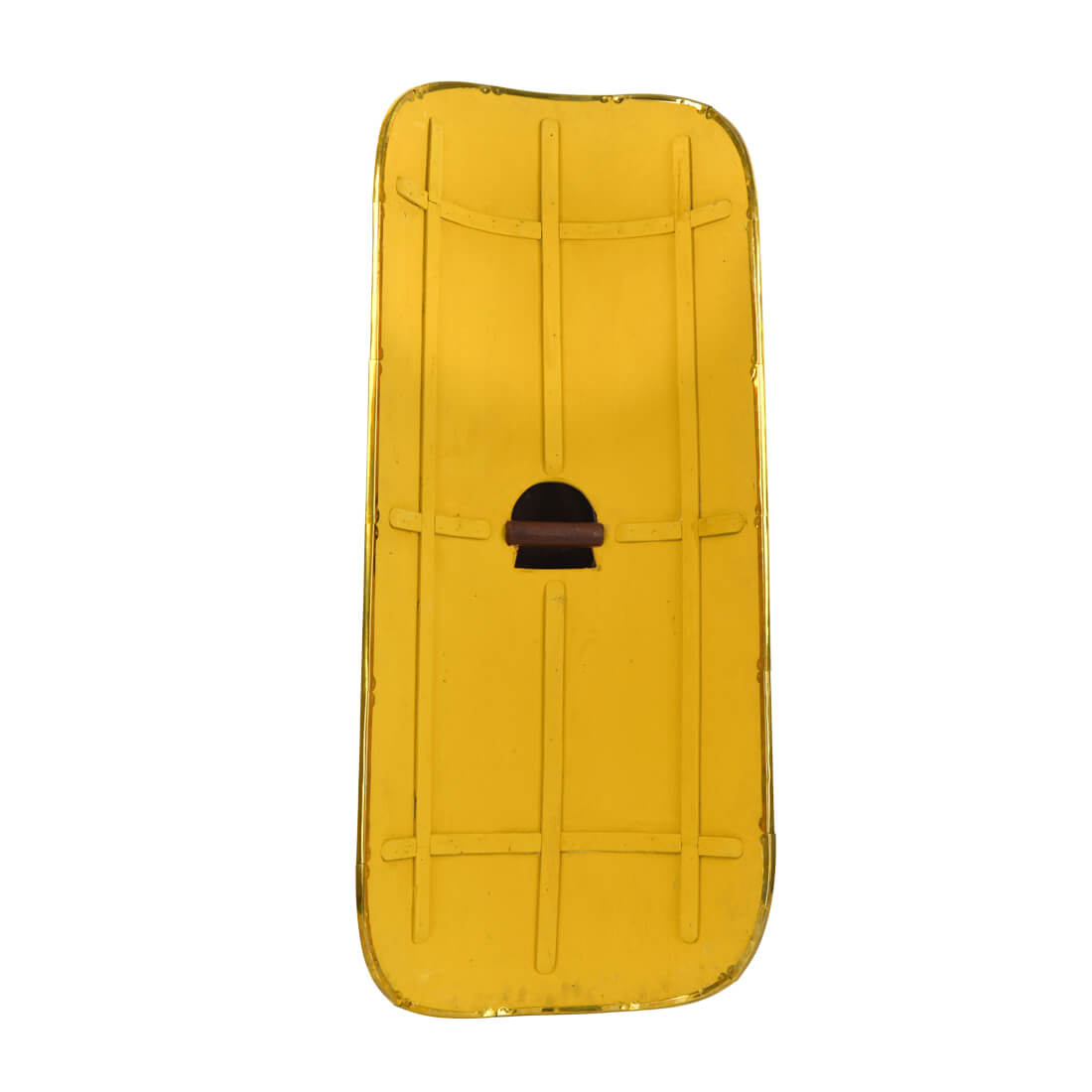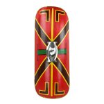 The Roman Scutum Shield made by Deepeeka is an accurate replica ornate based off historical research and authentic in its design. The Scutum, or shield, was the main form of body protection of the Roman soldiers. It served the purpose to deflect missiles targeted at the soldiers, as well as protect them from the impact of hand held weapons yielded at them. The shields large size allowed the soldiers to form a “tustudo’ or shield wall that could protect them during an advance. This Roman Republic Shield is constructed from poplar wood is backed in linen. It is fitted with a riveted brass trim and steel shield boss. The face of the shield is hand-painted and its reverse is reinforced with wooden bands and fitted with a horizontal grip of wood.