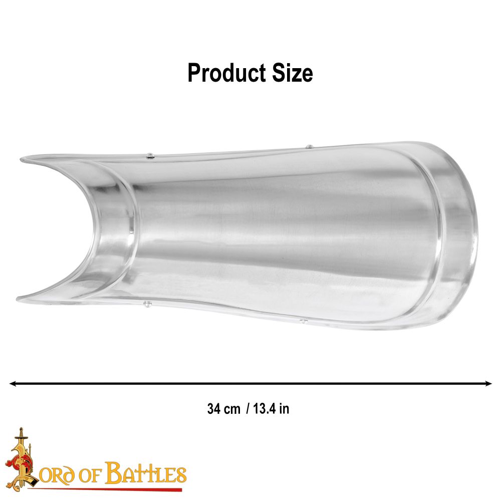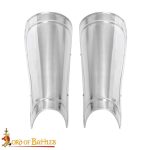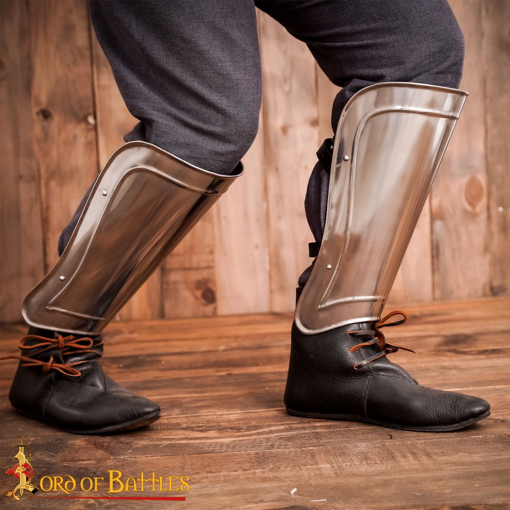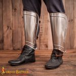 This set of greaves is constructed from 18 gauge steel; the interior of the greaves is blackened to give it some resistance to rusting. A pair of thick leather straps and antiqued steel buckles fit and adjust the fit of the greaves to the legs.