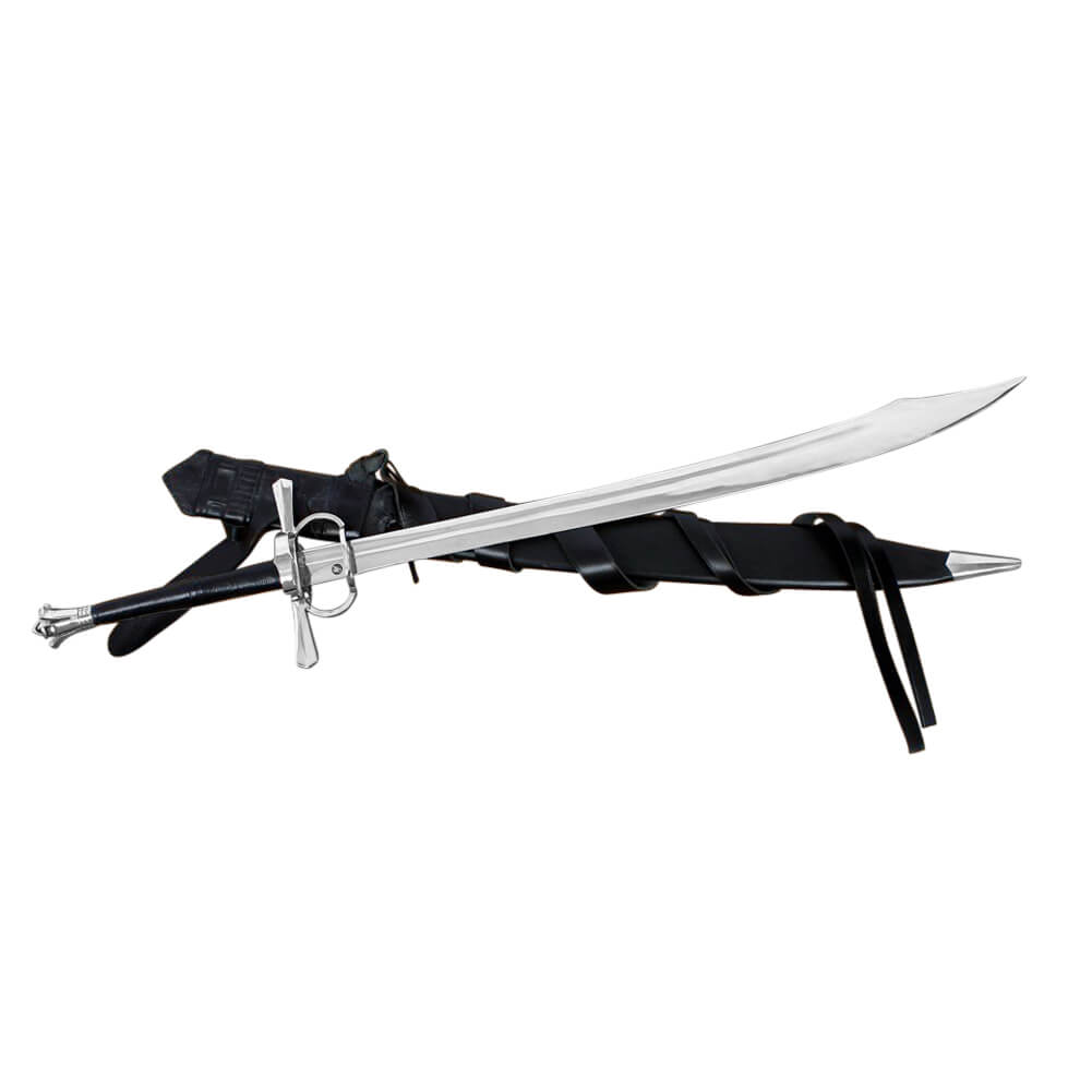 This historically inspired fantasy battle ready sword is based on the Swiss Saber, a two-handed, singled edged medieval sword of the renaissance and early modern period. The ringed hilt is typical of many 16th century swords, but the crown pommel is an original design (loosely based on a historical example).
