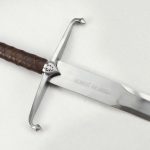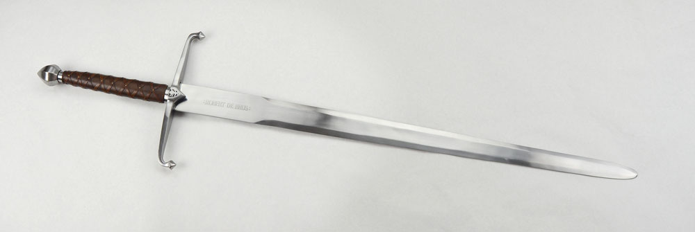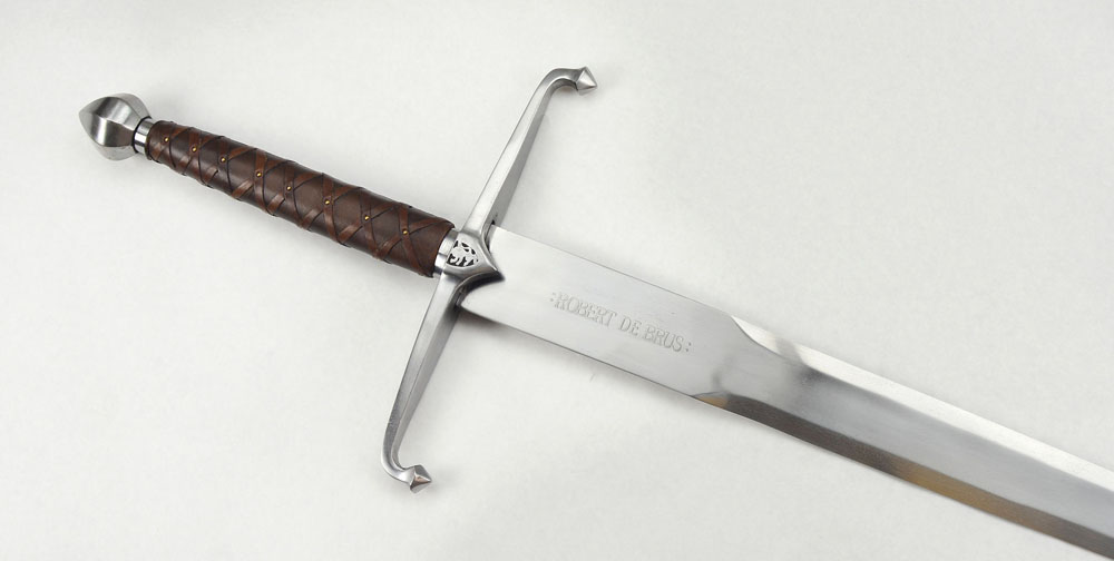 This Robert the Bruce Greatsword has a thick-edged blade built for sport and stage combat. The blade is EN45 high carbon steel and the guard and pommel are steel. The hilt is wood with a leather overwrap which was finished with a leatherwork crosshatch design with inset brass pins.