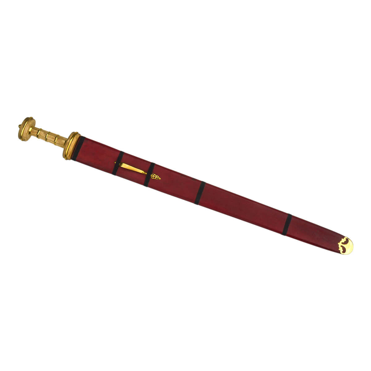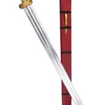 The blade of this reconstruction is made from high carbon steel and it is securely mounted into a hardwood hilt which is completed with brass banding. The sword comes with a wooden scabbard which is wrapped in tightly stitched red leather and completed with a brass chape and a suspension sling loop. Black cord banding finishes the scabbard and it can be worn by fitting your own belt or baldric through the brass suspension sling.