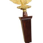This Roman Legionary Eagle Standard has a large and imposing (and weighty!) Eagle of brass and a two-part wooden shaft. The shaft has two metal grips that are painted to match the wood. The eagle is secured to the shaft with a retaining pin. The socket for the eagle is slightly larger than the wood shaft itself, so the eagle, though attached, does have some movement.