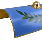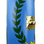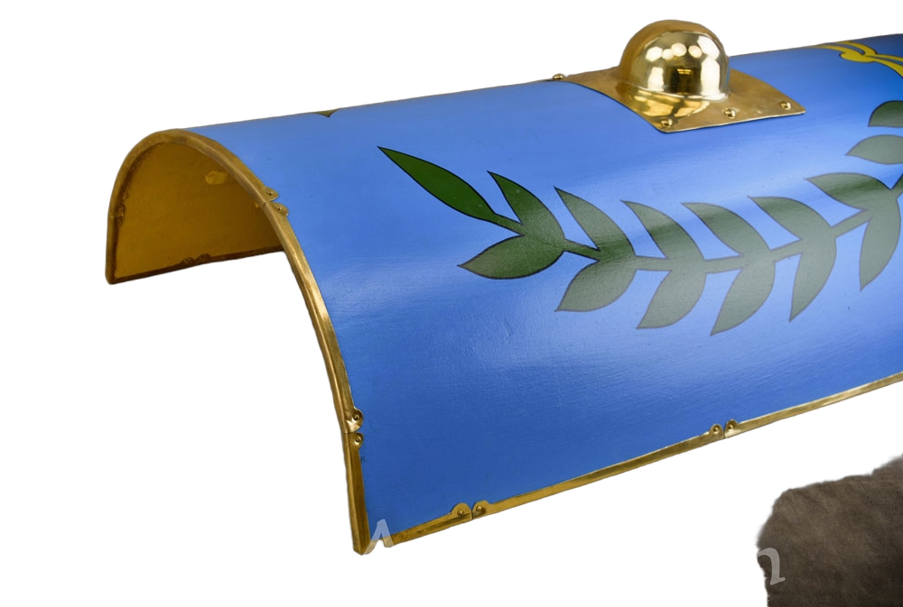 This Roman Arena Scutum is constructed from poplar wood and is tightly overlaid in linen and hand painted. The shield has a horizontal wooden grip on its reverse and a brass shield boss on its front. It is edged with riveted brass.