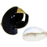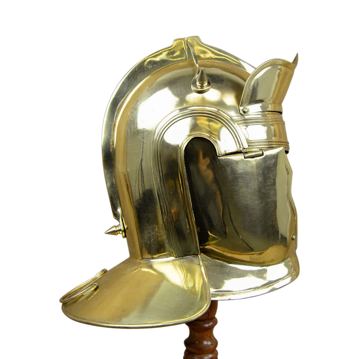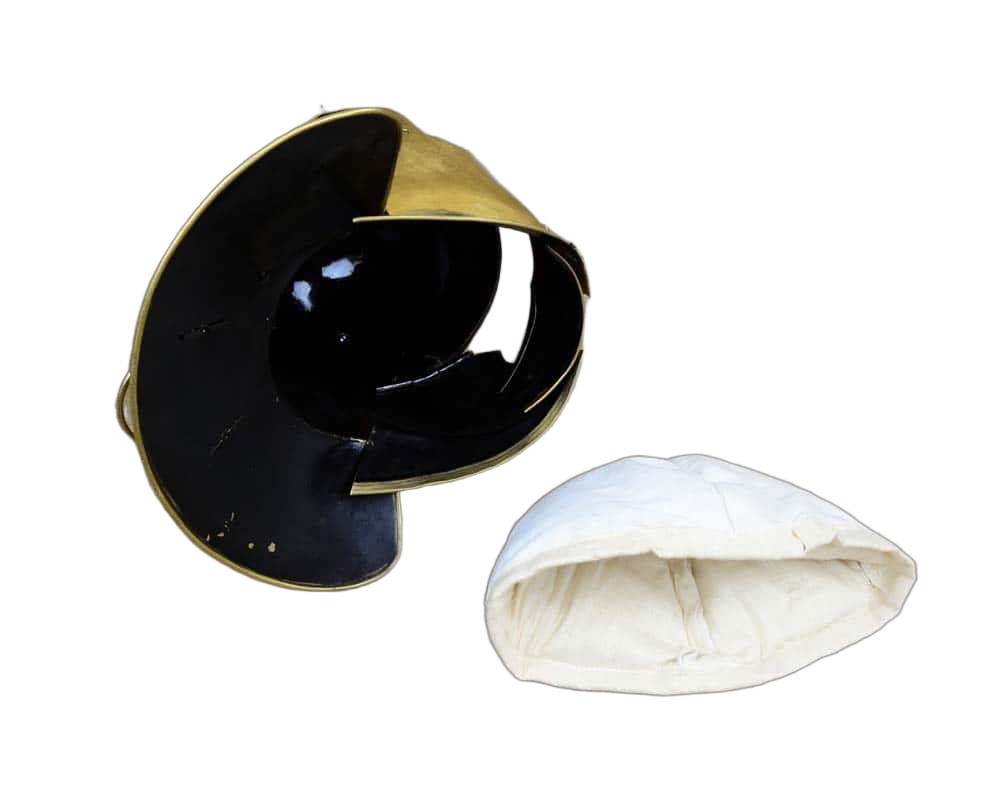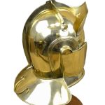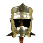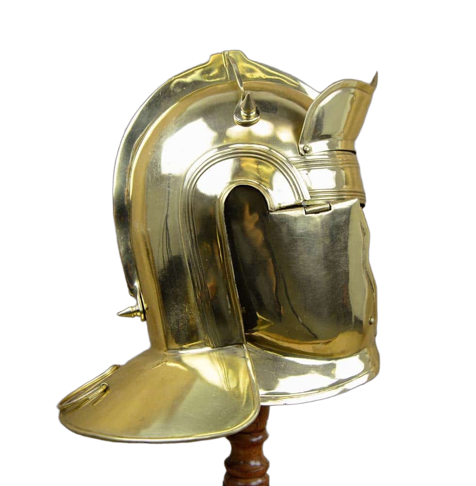 This Roman Auxiliary Cavalry Helm is constructed from 18 gauge brass the interior of the helm is unlined. The cheekplates are hinged and the chin plate is secured with a rotating brass pin. The helm comes with a simple padded arming cap.