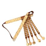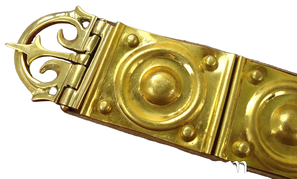 Made with high quality natural leather, this belt has embossed brass plates riveted in the leather. The Belt includes Pugio Holders & the Apron which has Brass Enamelled Rosettes. This is perfect for authentic reenactment, collection, or high end costumes.