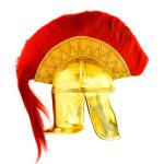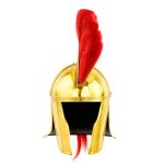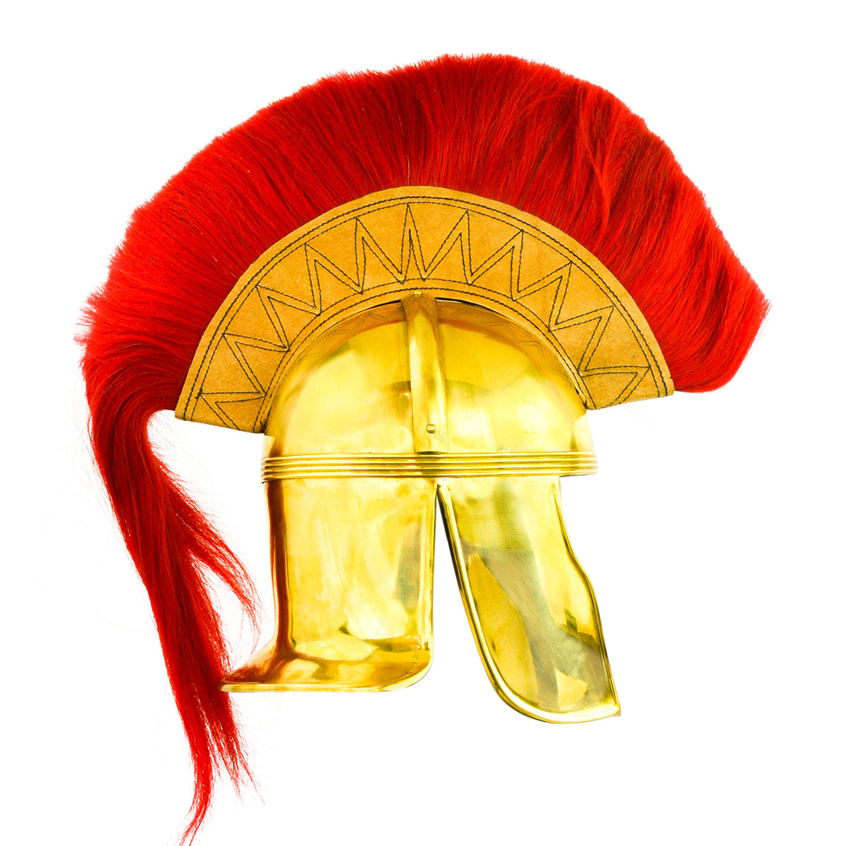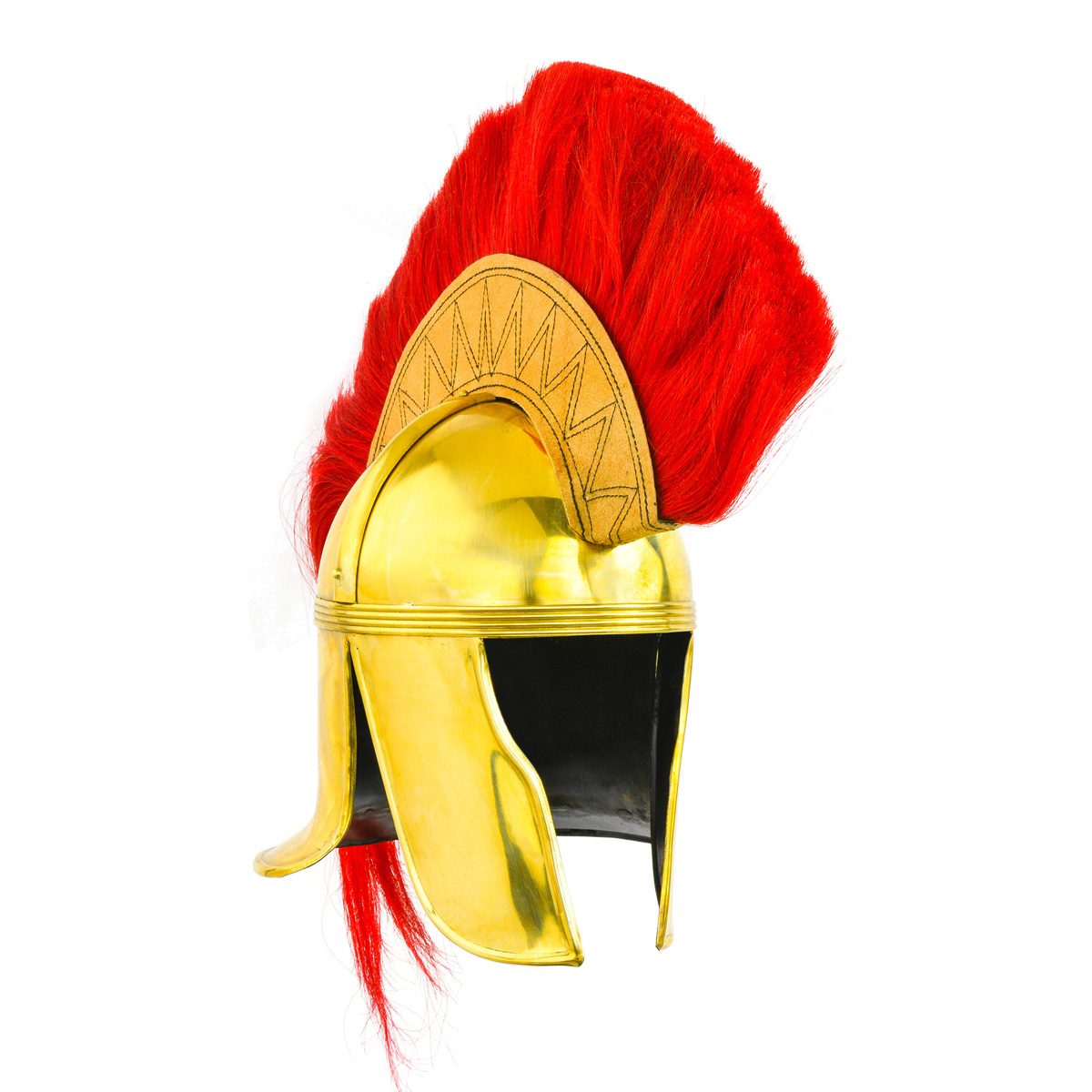 This Roman Cavalier helmet is constructed from brass and a crest of red horsehair with a wood base encased in leather is mounted atop the helmet. Two steel prongs that are screwed into the helmet hold the crest into position when mounted. The interior of the helmet is unlined and included is a separate padded arming cap of simple design.