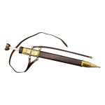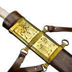 This functional replica Roman Cavalry Spatha has a tempered and durable blade of C60 high carbon steel which is sturdily mounted into a hilt of polished wood with a carved bone grip. Unlike its shorter-bladed cousin, this Roman sword has a longer blade intended for cavalry use. The sword is paired with a wooden scabbard which is bound in brown leather and completed with extensive brass plate embellishment and brass hanging rings. A leather sword baldric is included with the scabbard for wear.