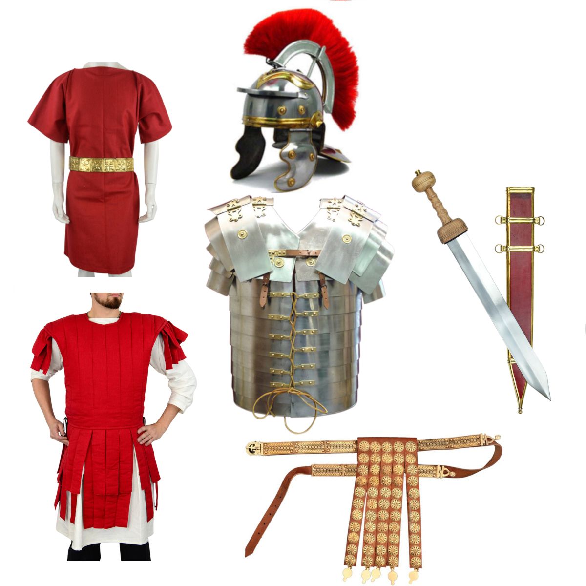 (1) Lorica Segementata (1) Roman Centurion Subarmalis (1) Roman Centurion Helmet (1) Roman Tunic (1) Roman Legionary Belt (1) Pompeii Gladius Sword
