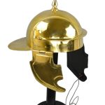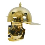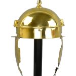 The Coolus ‘E’ (Walbrook) made by Deepeeka is an accurate replica ornate based off historical research and authentic in its design. The second known group of helmets, was the Coolus variety, which covered the period 3rd century BC to at least 79AD. These were based on a Gallic form of helmet made in the Coolus district of Marne. In form they were a simple hemispherical bowl made out of bronze with a reinforcing peak running horizontally across the brow and with a larger extension at the back as a neck guard. This Roman Coolus Helmet is constructed from 18 gauge brass and fitted with hinged cheekplates. It also has an integrated plume holders on its sides, and the top spike is notched to allow it to be used to hold a second plume. The inside of the helmet is blackened and unlined and the cheekplates have rings to tie a leather chin strap to (chin strap not included). Also included with the helm is a separate padded cotton arming cap.
