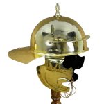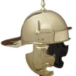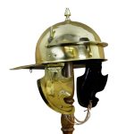 This Roman Coolus Helmet is constructed from 18 gauge brass and fitted with hinged cheekplates. It also has integrated plume holders on its sides, and the top spike is notched to allow it to be used to hold a central plume. The inside of the helmet is blackened and unlined and the cheekplates have rings to tie its leather chin strap to (chin strap included). Also included with the helm is a separate padded cotton arming cap.