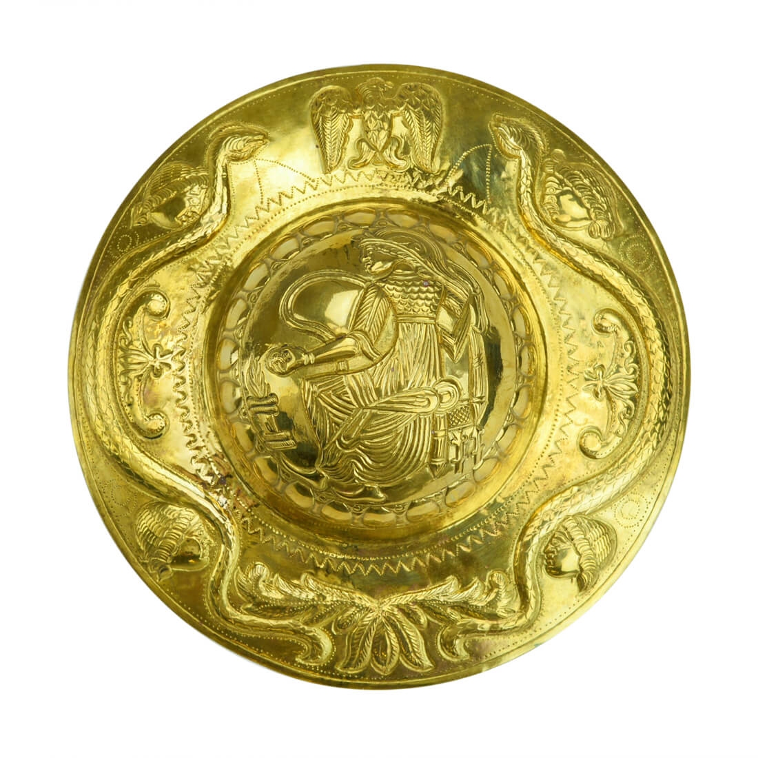 This embossed Roman shield boss, crafted from 20 gauge brass, features a blackened back, embodying the strength and artistry of ancient battlefield gear.